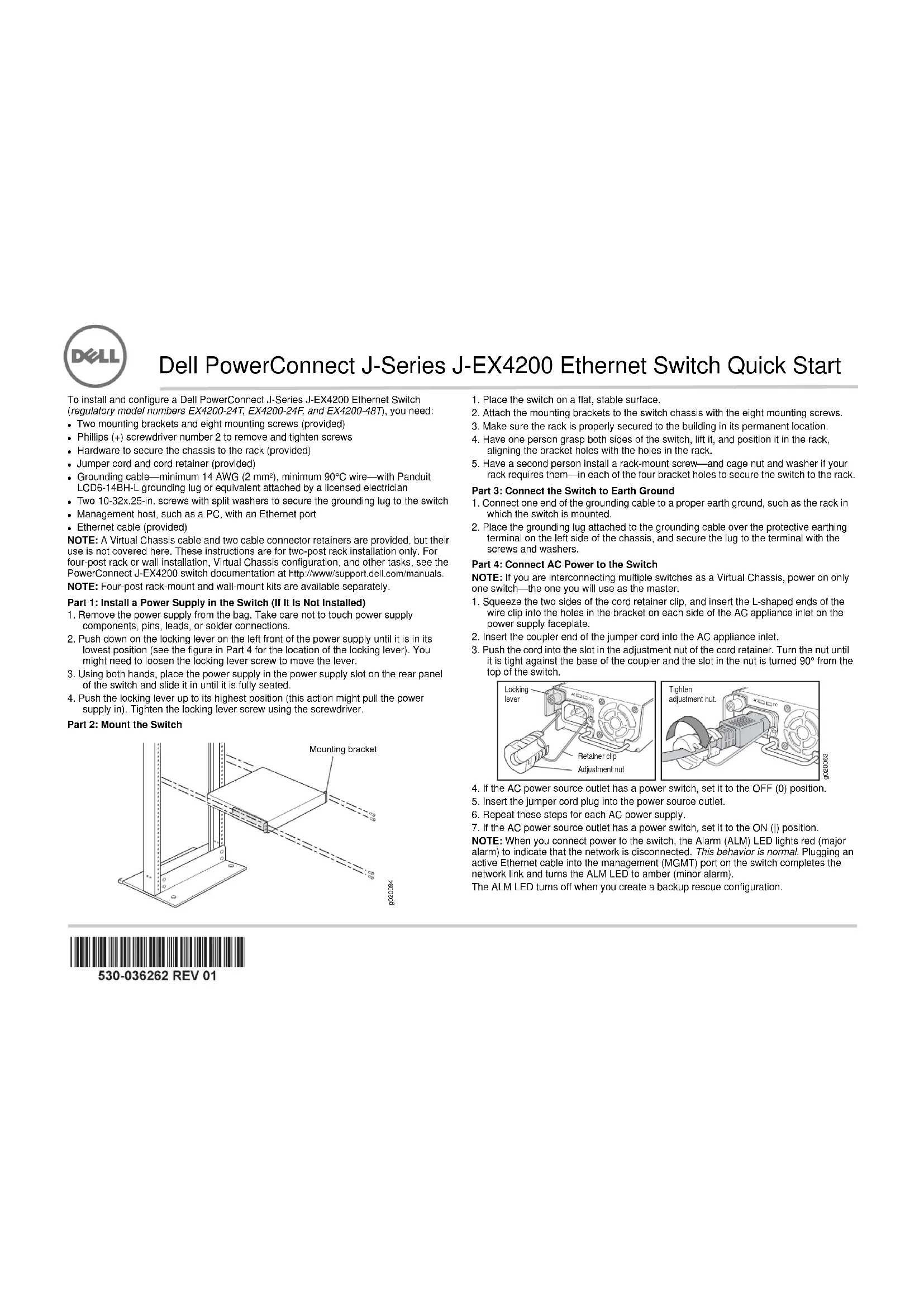 l’utilisateur à de graves blessures, voire mortelles. z Seules les personnes dûment formées et qualifiées doivent installer ou remplacer les composants des commutateurs. z Bornez-vous aux seules procédures décrites dans le présent guide de mise en route et dans la documentation du commutateur J-EX4200. Seul un personnel d’entretien autorisé peut exécuter d’autres opérations. z Avant d’installer le commutateur, reportez-vous aux instructions de planification fournies dans la documentation du commutateur J-EX4200 afin de vérifier que le site est conforme aux exigences électriques, environnementales et spatiales définies pour ce commutateur. z Avant de brancher le commutateur sur une source d’alimentation électrique, lisez les instructions d’installation fournies dans la documentation du commutateur J-EX4200. z Un commutateur J-EX4200 complètement équipé pèse 10 kg environ. Pour installer manuellement le commutateur dans une baie, deux personnes sont nécessaires : une pour soulever le commutateur et une autre pour insérer les vis de montage. Afin d’éviter toute blessure, gardez le dos bien droit et soulevez l’appareil en forçant sur vos jambes, et non sur votre dos. z Si la baie est équipée de stabilisateurs, installez ces derniers avant de procéder au montage ou à l’entretien du commutateur dans la baie. z Avant d’installer ou de retirer un composant électrique, placez-le toujours face du dessus tournée vers le haut sur une surface plane antistatique ou dans un sac électrostatique. z N’intervenez pas sur le commutateur et ne branchez ou ne débranchez pas les câbles électriques de celui-ci pendant un orage. z Avant d’intervenir sur des équipements raccordés à une ligne électrique, ôtez vos bijoux (notamment vos bagues, colliers et montre). Les objets métalliques s’échauffent lorsqu’ils sont raccordés à une alimentation électrique et à la terre, et peuvent ainsi provoquer de graves brûlures ou se souder aux bornes. Avertissement relatif au câble d’alimentation (japonais) Le câble d’alimentation est prévu uniquement pour ce produit. Ne l’utilisez pas pour un autre produit. Contacter Dell Inc. Pour obtenir une assistance technique, consultez le site Web http://www.support.dell.com. g040300Dell PowerConnect J-Series J-EX4200 Ethernet-Switch – Schnellstart Zur Installation und Konfiguration eines J-EX4200 Ethernet-Switch der Dell PowerConnect J-Series (Modellnummern EX4200-24T, EX4200-24F und EX4200-48T) benötigen Sie Folgendes: z Zwei Montagehalterungen und acht Befestigungsschrauben (mitgeliefert)z Kreuzschlitzschraubendreher (+) Nummer 2 zum Lösen und Befestigen von Schraubenz Hardware zum Befestigen des Chassis am Rack (mitgeliefert)z Jumperkabel und Kabelhalterung (mitgeliefert)z Erdungskabel, mind. 14 AWG (2 mm²), mind. 90°C-Kabel mit Panduit LCD6-14BH-L-Erdungslasche oder eine gleichwertige von einem Elektriker montierte Erdungslasche z Zwei 10-32x-0,25-Zoll-Schrauben mit Federring zum Befestigen der Erdungslasche am Switch z Managementhost wie beispielsweise ein PC mit einem Ethernet-Port z Ethernet-Kabel (mitgeliefert) HINWEIS: Ein Virtual Chassis-Kabel und zwei Kabelbinder werden ebenfalls mitgeliefert, in diesem Handbuch allerdings nicht beschrieben. Diese Anweisungen gelten nur für die Installation in einem Rack mit zwei Stützen. Informationen zur Installation in einem Rack mit vier Stützen oder zur Wandinstallation, zur Virtual-Chassis-Konfiguration und zu anderen Aufgaben finden Sie in der PowerConnect J-EX4200-Switch-Dokumentation unter http://www/support.dell.com/manuals. HINWEIS: Informationen zur Installation in einem Rack mit vier Stützen oder zur Wandinstallation sind separat erhältlich. Teil 1: Installation eines Netzteils im Switch (falls nicht installiert)