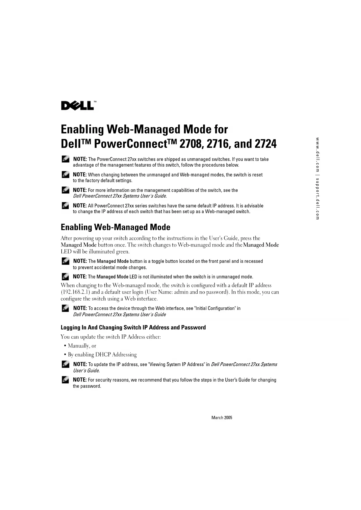Les informations contenues dans ce document peuvent être modifiées sans préavis. © 2005 Dell Inc. Tous droits réservés. Imprimé en Chine. La reproduction de ce document de quelque manière que ce soit sans l'autorisation écrite de Dell Inc. est strictement interdite. Marques utilisées dans ce document : Dell et le logo DELL sont des marques de Dell Inc. Tous les autres noms de marques et marques commerciales utilisés dans ce document se rapportent aux sociétés propriétaires des marques et des noms de ces produits. Dell Inc. décline tout intérêt dans l'utilisation des marques déposées et des noms de marques ne lui appartenant pas. Tableau 1. Configuration par défaut Mode non géré Mode géré Voyant du mode géré Éteint Vert IP Aucune Adresse IP et masque réseau par défaut, pas de passerelle, DHCP désactivé Base de données utilisateur Aucune Nom d'utilisateur “admin”, pas de mot de passe BD de configuration N/A Les valeurs par défaut sont utilisées jusqu'à ce qu'elles soient modifiées, et rétablies chaque fois que vous appuyez sur le bouton Managed mode (Mode géré).www.dell.com | support.dell.com Aktivieren der Web-Verwaltung für Dell