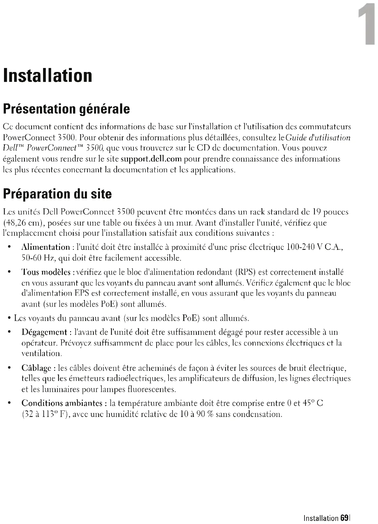 - Configuration initiale SommaireInstallation 69 Installation Présentation générale Ce document contient des informations de base sur l'installation et l'utilisation des commutateurs PowerConnect 3500. Pour obtenir des informations plus détaillées, consultez le Guide d'utilisation Dell™ PowerConnect™ 3500 , que vous trouverez sur le CD de documentation. Vous pouvez également vous rendre sur le site support.dell.com pour prendre connaissance des informations les plus récentes concernant la documentation et les applications. Préparation du site Les unités Dell PowerConnect 3500 peuvent être montées dans un rack standard de 19 pouces (48,26 cm), posées sur une table ou fixées à un mur. Avant d'installer l'unité, vérifiez que l'emplacement choisi pour l'installation satisfait aux conditions suivantes : p. 8168
