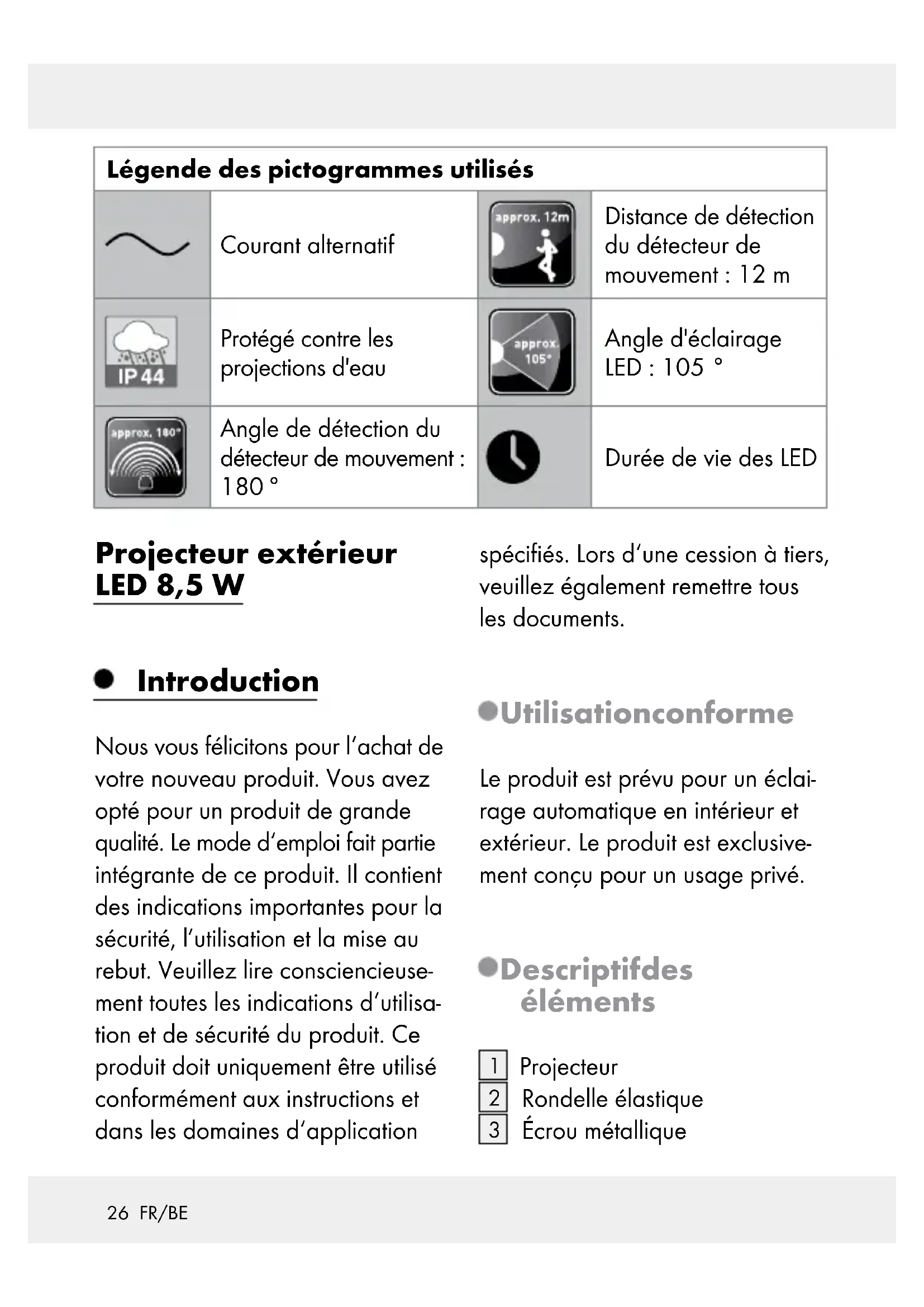 Serre-câble Caractéristiques tech- niques Tension de service : 230 V ∼, 50 Hz, 8,5 W LED : 16 x LED à 0,5 W Interrupteur crépusculaire : réglable de 10 lx à 20000 lx Durée d‘éclairage : réglable d‘env. 10 s–4 min Classe de protection : I Type de protection : IP44 (protégé contre les projec- tions d‘eau) Dimensions (h x l x p) : env. 197 x 149 x 121 mm Surface de projection : max. 190 x 149 mm Hauteur de montage : approx. 2,5 m Poids : approx. 640 g Contenu de la livraison 1 Projecteur d‘extérieur LED avec détecteur de mouvement 2 Chevilles (Ø 6 mm) 2 Vis 1 Notice d‘utilisation et de montage28 FR/BE Instructions générales de sécurité Prenez connaissance de toutes les indications de maniement et de sécurité avant d‘utiliser l‘appareil pour la première fois ! Transmettez également tous les documents en cas de transmission du produit à une personne tierce ! DANGER DE