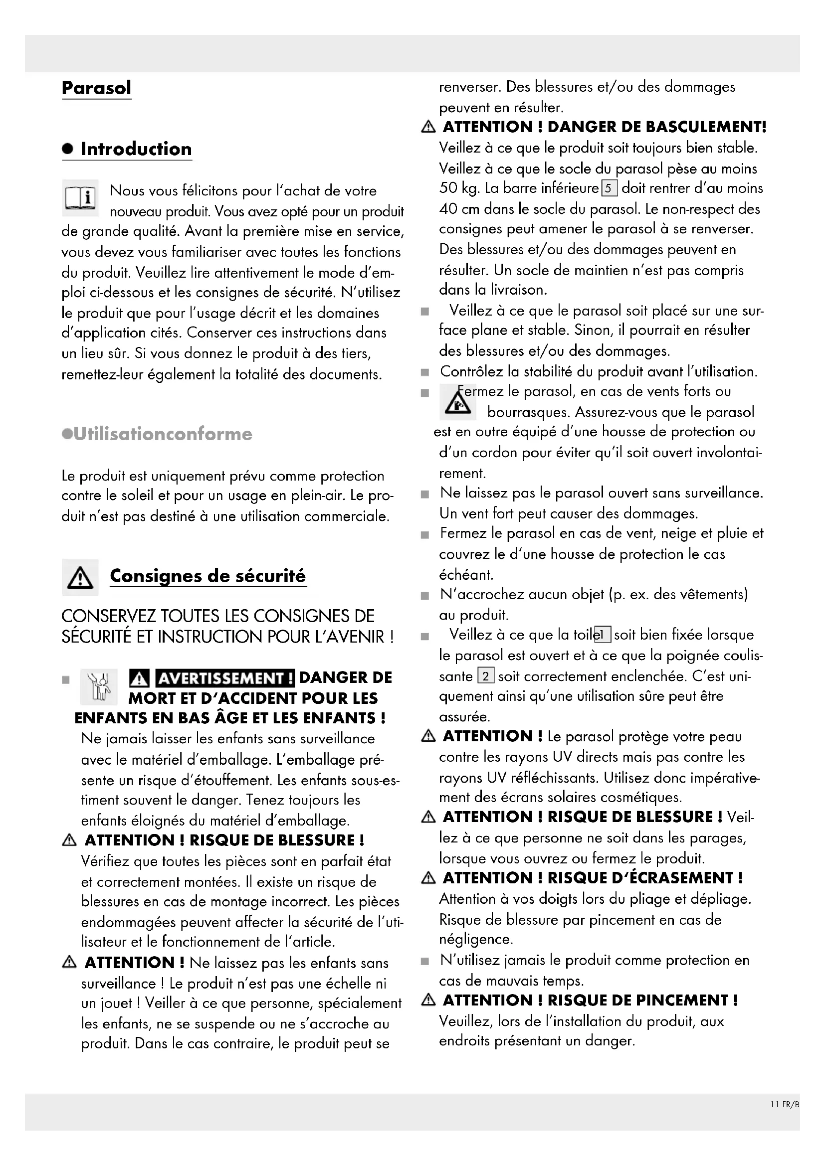 ENFANTS EN BAS ÂGE ET LES ENFANTS ! Ne jamais laisser les enfants sans surveillance avec le matériel d’emballage. L‘emballage pré- sente un risque d‘étouffement. Les enfants sous-es- timent souvent le danger. Tenez toujours les enfants éloignés du matériel d’emballage. ATTENTION ! RISQUE DE BLESSURE ! Vérifiez que toutes les pièces sont en parfait état et correctement montées. Il existe un risque de blessures en cas de montage incorrect. Les pièces endommagées peuvent affecter la sécurité de l‘uti- lisateur et le fonctionnement de l‘article. ATTENTION ! Ne laissez pas les enfants sans surveillance! Le produit n’est pas une échelle ni un jouet ! Veiller à ce que personne, spécialement les enfants, ne se suspende ou ne s’accroche au produit. Dans le cas contraire, le produit peut se renverser. Des blessures et/ou des dommages peuvent en résulter. ATTENTION ! DANGER DE BASCULEMENT! Veillez à ce que le produit soit toujours bien stable. Veillez à ce que le socle du parasol pèse au moins 50 kg. La barre inférieure