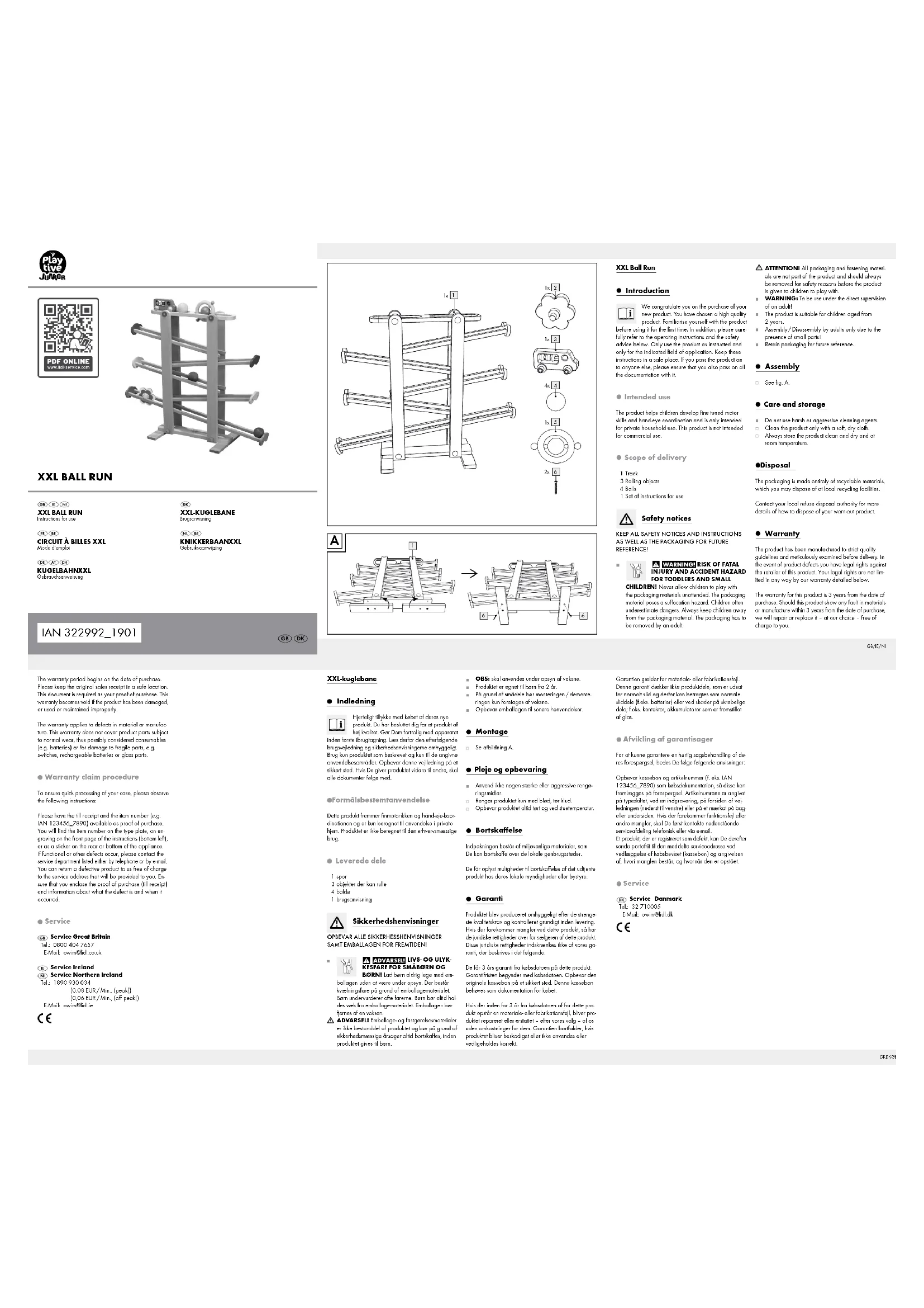 Ce produit bénéficie d‘une garantie de 3 ans à compter de sa date d’achat. La durée de garantie débute à la date d’achat. Veuillez conserver le ticket de caisse ori- ginal. Il fera office de preuve d’achat. Si un problème matériel ou de fabrication devait survenir dans 3 ans suivant la date d‘achat de ce produit, nous assurons à notre discrétion la réparation ou le remplace- ment du produit sans frais supplémentaires. La garantie prend fin si le produit est endommagé suite à une utili- sation inappropriée ou à un entretien défaillant. La garantie couvre les vices matériels et de fabrication. Cette garantie ne s’étend ni aux pièces du produit sou- mises à une usure normale (p. ex. des piles) et qui, par conséquent, peuvent être considérées comme des pièces d’usure, ni aux dommages sur des composants fragiles, comme des interrupteurs, des batteries ou des éléments fabriqués en verre. Faire valoir sa garantie Pour garantir la rapidité d’exécution de la procédure de garantie, veuillez respecter les indications suivantes : Veuillez conserver le ticket de caisse et la référence du produit (par ex. IAN 123456_7890) à titre de preuve d’achat pour toute demande. Le numéro de référence de l’article est indiqué sur la plaque d’identification, gravé sur la page de titre de votre manuel (en bas à gauche) ou sur un autocollant apposé sur la face arrière ou inférieure du produit. En cas de dysfonctionnement du produit, ou de tout autre défaut, contactez en premier lieu le service après- vente par téléphone ou par e-mail aux coordonnées in- diquées ci-dessous. Vous pouvez alors envoyer franco de port tout produit considéré comme défectueux au service clientèle indi- qué, accompagné de la preuve d’achat (ticket de caisse) et d’une description écrite du défaut avec men- tion de sa date d’apparition. Service après-vente Service après-vente France Tél. : 0800 919270 E-Mail : owim@lidl.fr Service après-vente Belgique Tél. : 070 270 171 (0,15 EUR / Min.) E-Mail : owim@lidl.be Circuit à billes XXL Introduction Nous vous félicitons pour l‘achat de votre nouveau produit. Vous avez opté pour un produit de grande qualité. Avant la première mise en service, vous devez vous familiariser avec toutes les fonctions du produit. Veuillez lire attentivement le mode d’emploi ci-dessous et les consignes de sécurité. N’utilisez le produit que pour l’usage décrit et les do- maines d’application cités. Conserver ces instructions dans un lieu sûr. Si vous donnez le produit à des tiers, remettez-leur également la totalité des documents. Utilisation conforme Le produit stimule la motricité fine et la coordination œil-main. Il et est uniquement réservé à un usage do- mestique. Le produit n‘est pas destiné à une utilisation commerciale. Contenu de la livraison 1 circuit 3 objets roulants 4 balles 1 mode d‘emploi Consignes de sécurité