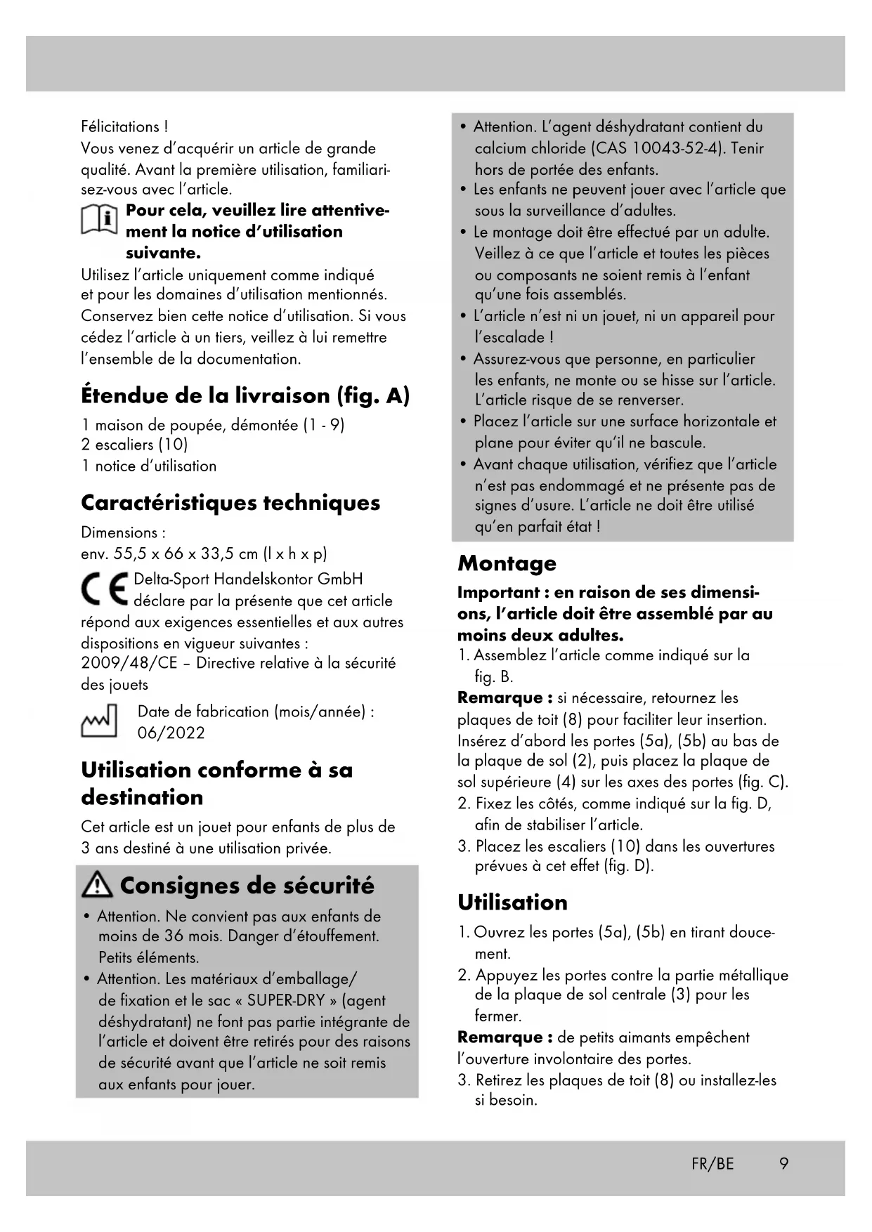 - s‘il présente les qualités qu‘un acheteur peut légitimement attendre eu égard aux déclara- tions publiques faites par le vendeur, par le producteur ou par son représentant, notam- ment dans la publicité ou l‘étiquetage ; 2° Ou s‘il présente les caractéristiques définies d‘un commun accord par les parties ou être propre à tout usage spécial recherché par l‘acheteur, porté à la connaissance du vendeur et que ce dernier a accepté. Article L217-12 du Code de la consommation L‘action résultant du défaut de conformité se prescrit par deux ans à compter de la délivrance du bien. Article 1641 du Code civil Le vendeur est tenu de la garantie à raison des défauts cachés de la chose vendue qui la rendent impropre à l‘usage auquel on la destine, ou qui diminuent tellement cet usage que l‘acheteur ne l‘aurait pas acquise, ou n‘en aurait donné qu‘un moindre prix, s‘il les avait connus. Article 1648 1er alinéa du Code civil L‘action résultant des vices rédhibitoires doit être intentée par l‘acquéreur dans un délai de deux ans à compter de la découverte du vice. Les pièces détachées indispensables à l’utili- sation du produit sont disponibles pendant la durée de la garantie du produit. IAN : 393062_2201 Service Belgique Tel. : 0800 12089 E-Mail : deltasport@lidl.be12 Gefeliciteerd! Met uw aankoop hebt u voor een hoogwaardig artikel gekozen. Zorg ervoor dat u voor het eerste gebruik met het artikel vertrouwd raakt. Lees hiervoor de volgende gebruiksaanwijzing zorgvuldig door. Gebruik het artikel alleen zoals omschreven en voor het aangegeven doel. Bewaar deze ge- bruiksaanwijzing goed. Geef alle documenten mee als u het artikel aan iemand anders geeft. Leveringsomvang (afb. A) 1 x poppenhuis, gedemonteerd (1 - 9) 2 x trap (10) 1 x gebruiksaanwijzing Technische gegevens Afmetingen: ca. 55,5 x 66 x 33,5 cm (b x h x d) Hierbij verklaart Delta-Sport Handelskon- tor GmbH dat dit artikel voldoet aan de volgende basiseisen en de overige ter zake doende bepalingen: 2009/48/EG – Speelgoedrichtlijn Productiedatum (maand/jaar): 06/2022 Beoogd gebruik Dit artikel is speelgoed voor kinderen vanaf 3 jaar oud voor particulier gebruik. Veiligheidstips
