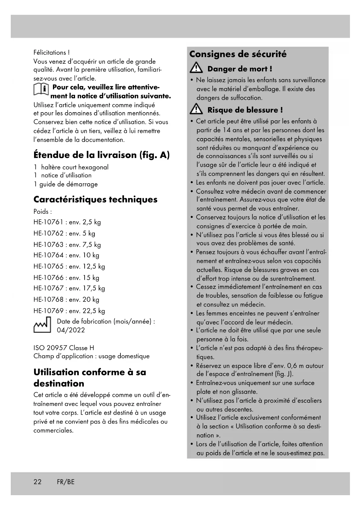 - s‘il présente les qualités qu‘un acheteur peut légitimement attendre eu égard aux déclara- tions publiques faites par le vendeur, par le producteur ou par son représentant, notam- ment dans la publicité ou l‘étiquetage ; 2° Ou s‘il présente les caractéristiques définies d‘un commun accord par les parties ou être propre à tout usage spécial recherché par l‘acheteur, porté à la connaissance du vendeur et que ce dernier a accepté. Article L217-12 du Code de la consommation L‘action résultant du défaut de conformité se prescrit par deux ans à compter de la délivrance du bien. Article 1641 du Code civil Le vendeur est tenu de la garantie à raison des défauts cachés de la chose vendue qui la rendent impropre à l‘usage auquel on la destine, ou qui diminuent tellement cet usage que l‘acheteur ne l‘aurait pas acquise, ou n‘en aurait donné qu‘un moindre prix, s‘il les avait connus. Article 1648 1er alinéa du Code civil L‘action résultant des vices rédhibitoires doit être intentée par l‘acquéreur dans un délai de deux ans à compter de la découverte du vice. Les pièces détachées indispensables à l’utili- sation du produit sont disponibles pendant la durée de la garantie du produit. IAN : 404074_2110 (22,5 kg) IAN : 404075_2110 (20 kg) IAN : 404076_2110 (17,5 kg) IAN : 404077_2110 (15 kg) IAN : 404078_2110 (12,5 kg) IAN : 404080_2110 (10 kg) IAN : 404081_2110 (7,5 kg) IAN : 404083_2110 (5 kg) IAN : 404084_2110 (2,5 kg) Service France Tel. : 0800 919270 E-Mail : deltasport@lidl.fr Service Belgique Tel. : 070 270 171 (0,15 EUR/Min.) E-Mail : deltasport@lidl.be FR/BE29NL/BE Gefeliciteerd! Met uw aankoop hebt u voor een hoogwaardig artikel gekozen. Zorg ervoor dat u voor het eerste gebruik met het artikel vertrouwd raakt. Lees hiervoor de volgende ge- bruiksaanwijzing zorgvuldig door. Gebruik het artikel alleen zoals omschreven en voor het aangegeven doel. Bewaar deze ge- bruiksaanwijzing goed. Geef alle documenten mee als u het artikel aan iemand anders geeft. Leveringsomvang (afb. A) 1 x zeshoekige halter 1 x gebruiksaanwijzing 1 x korte handleiding Technische gegevens Gewicht: HE-10761: ca. 2,5 kg HE-10762: ca. 5 kg HE-10763: ca. 7,5 kg HE-10764: ca. 10 kg HE-10765: ca. 12,5 kg HE-10766: ca. 15 kg HE-10767: ca. 17,5 kg HE-10768: ca. 20 kg HE-10769: ca. 22,5 kg Productiedatum (maand/jaar): 04/2022 ISO 20957 klasse H Toepassingsgebied: huiselijke omgeving Beoogd gebruik Dit artikel is ontwikkeld als een trainingsappa- raat waarmee u uw hele lichaam kunt trainen. Het artikel is bestemd voor particulier gebruik en is niet geschikt voor medische of commerciële doeleinden. Veiligheidstips Levensgevaar!