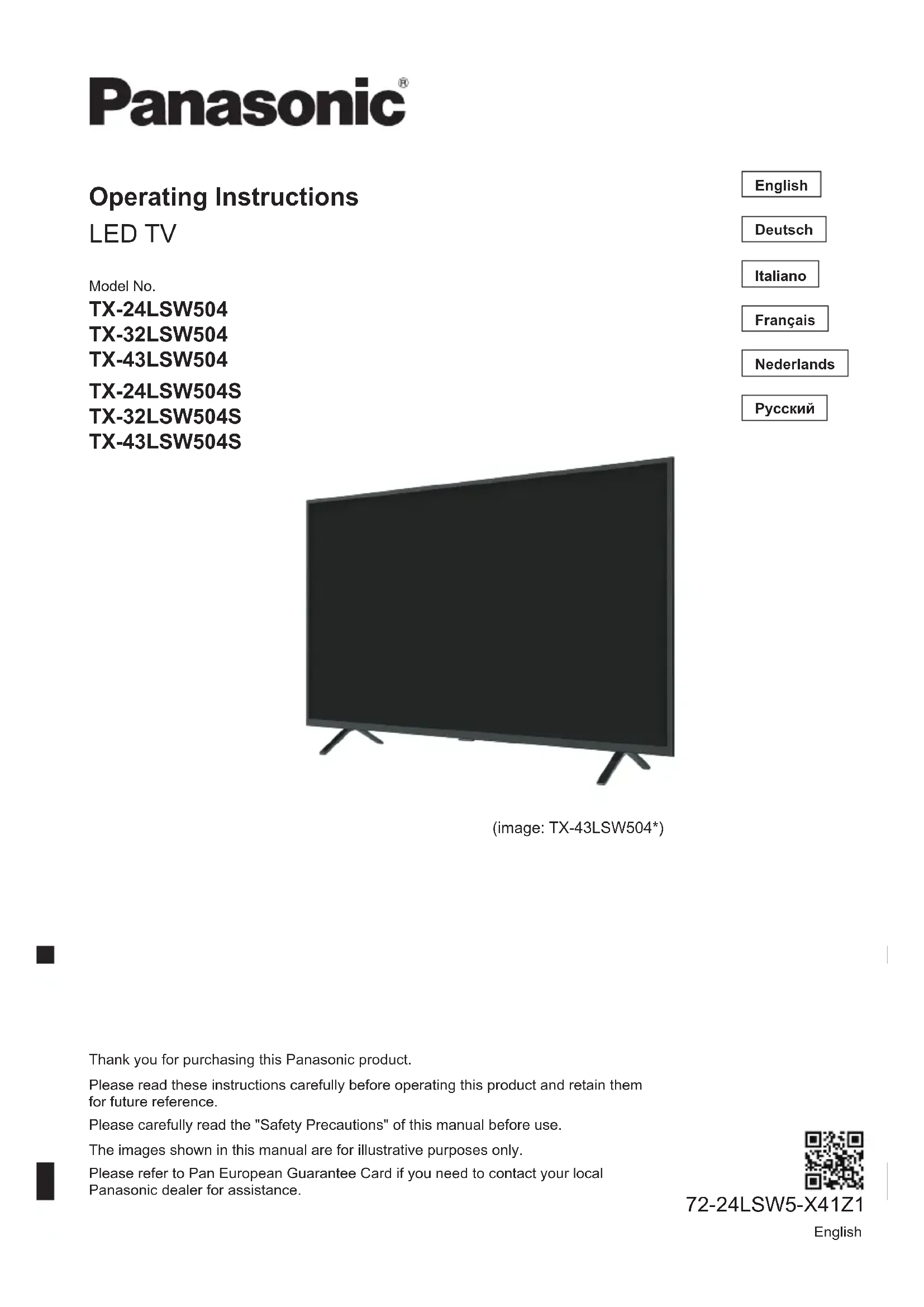 Français Nous vous remercions d’avoir choisi ce produit Panasonic. Veuillez lire attentivement ces instructions avant d’utiliser ce produit et les conserver pour toute consultation future. Veuillez lire également les « Consignes de sécurité » données dans ce manuel avant l’utilisation. Les images de ce manuel sont données uniquement à titre d’illustration. Veuillez vous référer à la Carte de garantie paneuropéenne si vous devez contacter votre revendeur Panasonic local pour obtenir de l’aide. (illustration : TX-43LSW504*) FrançaisFrançais