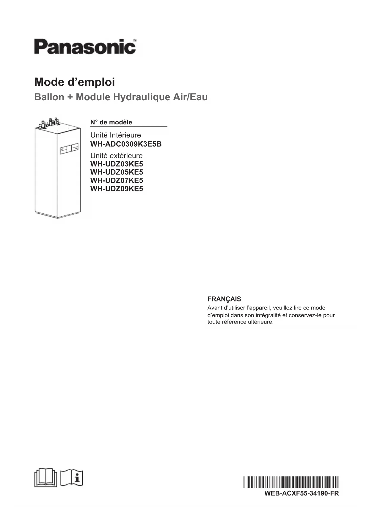 Unité extérieure WH-UDZ03KE5 WH-UDZ05KE5 WH-UDZ07KE5 WH-UDZ09KE5 FRANÇAIS Avant d’utiliser l’appareil, veuillez lire ce mode d’emploi dans son intégralité et conservez-le pour toute référence ultérieure.