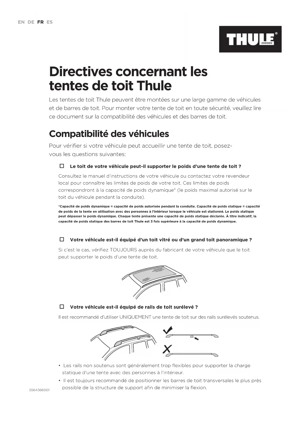 Das Fahrzeugauswahl-Tool auf thule.com berücksichtigt den Traversenabstand Deines Fahrzeugs nicht. Bitte miss daher den Traversenabstand Deiner Dachträger, um die Kompatibilität sicherzustellen. Hinweis: © Thule Group March 2024. All rights reserved. Thule Sweden AB Borggatan 5 335 73 Hillerstorp, Sweden info@thule.com www.thule.comCompatibilité des véhicules Pour vérifier si votre véhicule peut accueillir une tente de toit, posez- vous les questions suivantes: Le toit de votre véhicule peut-il supporter le poids d’une tente de toit? Consultez le manuel d’instructions de votre véhicule ou contactez votre revendeur local pour connaître les limites de poids de votre toit. Ces limites de poids correspondront à la capacité de poids dynamique* (le poids maximal autorisé sur le toit du véhicule pendant la conduite). *Capacité de poids dynamique = capacité de poids autorisée pendant la conduite. Capacité de poids statique = capacité de poids de la tente en utilisation avec des personnes à l’intérieur lorsque le véhicule est stationné. Le poids statique peut dépasser le poids dynamique. Chaque tente présente une capacité de poids statique déclarée. À titre indicatif, la capacité de poids statique des barres de toit Thule est 3fois supérieure à la capacité de poids dynamique. Votre véhicule est-il équipé d’un toit vitré ou d’un grand toit panoramique? Si c’est le cas, vérifiez TOUJOURS auprès du fabricant de votre véhicule que le toit peut supporter le poids d’une tente de toit. Votre véhicule est-il équipé de rails de toit surélevé? Il est recommandé d’utiliser UNIQUEMENT une tente de toit sur des rails surélevés soutenus.