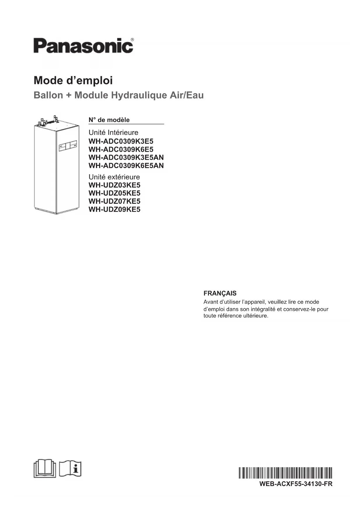 Unité extérieure WH-UDZ03KE5 WH-UDZ05KE5 WH-UDZ07KE5 WH-UDZ09KE5 FRANÇAIS Avant d’utiliser l’appareil, veuillez lire ce mode d’emploi dans son intégralité et conservez-le pour toute référence ultérieure.