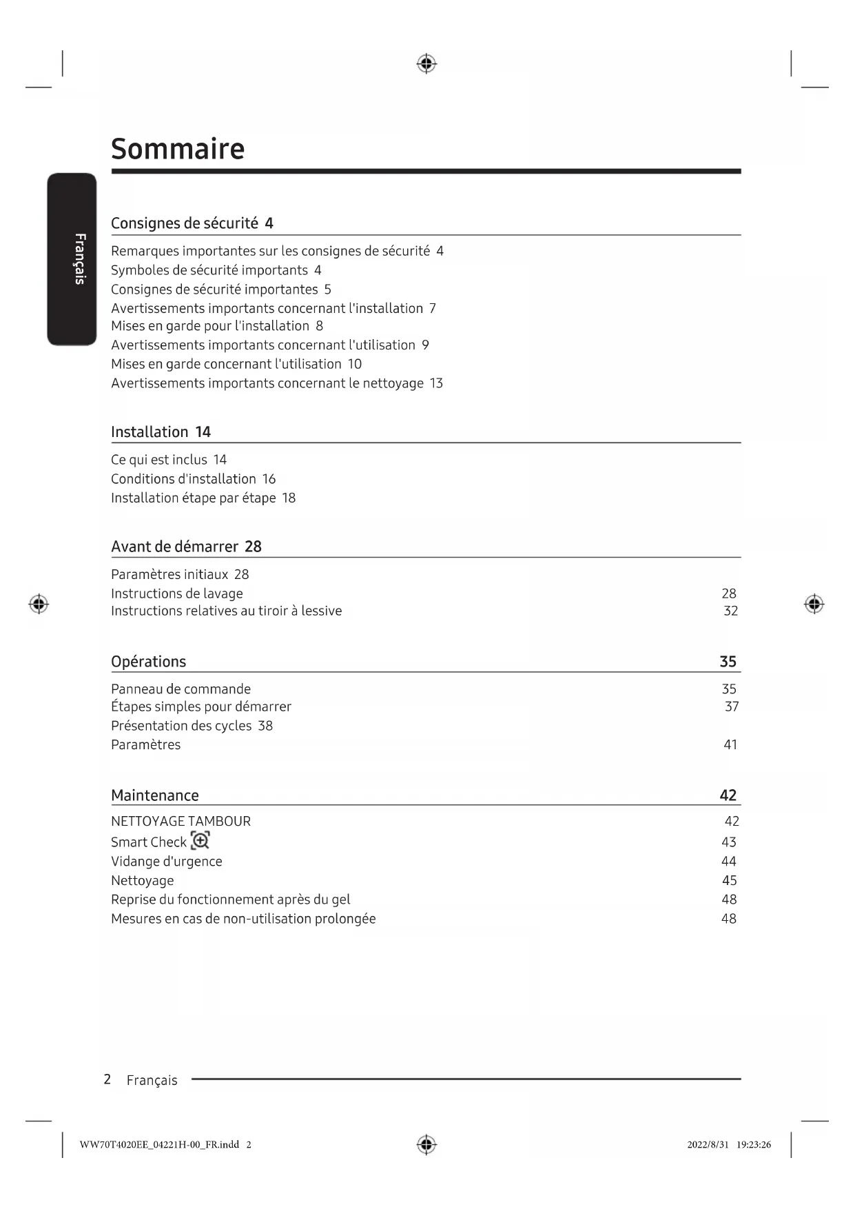Sommaire Consignes de sécurité 4 Remarques importantes sur les consignes de sécurité 4 Symboles de sécurité importants 4 Consignes de sécurité importantes 5 Avertissements importants concernant l'installation 7 Mises en garde pour l'installation 8 Avertissements importants concernant l'utilisation 9 Mises en garde concernant l'utilisation 10 Avertissements importants concernant le nettoyage 13 Installation 14 Ce qui est inclus 14 Conditions d'installation 16 Installation étape par étape 18 Avant de démarrer 28 Paramètres initiaux 28 Instructions de lavage 28 Instructions relatives au tiroir à lessive 32 Opérations 35 Panneau de commande 35 Étapes simples pour démarrer 37 Présentation des cycles 38 Paramètres 41 Maintenance 42 NETTOYAGE TAMBOUR 42 Smart Check 43 Vidange d'urgence 44 Nettoyage 45 Reprise du fonctionnement après du gel 48 Mesures en cas de non-utilisation prolongée 48 WW70T4020EE_04221H-00_FR.indd 2 2022/8/31 19:23:26Français