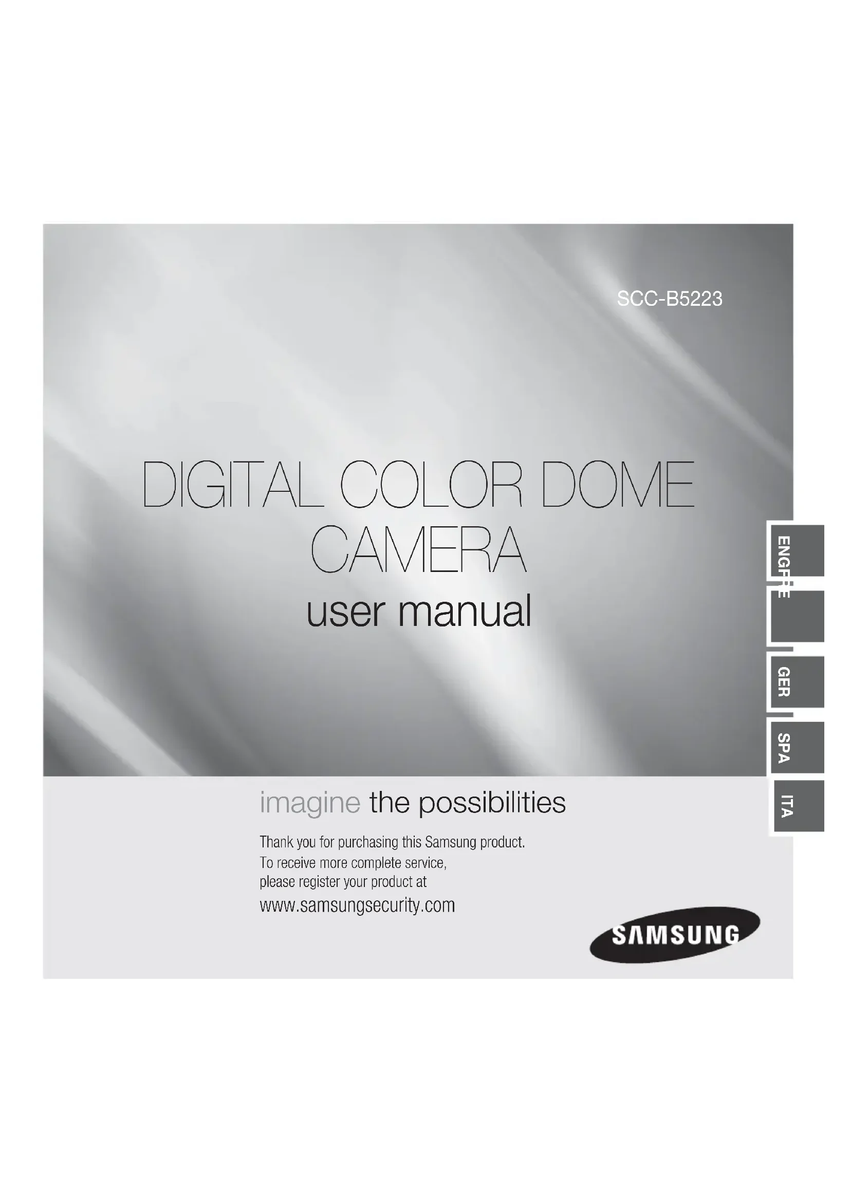 VSSfra _41184.indd 1VSSfra _41184.indd 1 2009-5-21 17:39:162009-5-21 17:39:16Manuel de l’utilisateur Comment éliminer ce produit (déchets d’équipements électriques et électroniques) (Applicable dans les pays de l’Union Européen et aux autres pays européens disposant de systémes de collecte sélective) Ce symbole sur le produit ou sa documentation indique qu’il ne doit pas être éliminé en fin de vie avec les autres déchets ménagers. L’élimination incontrôlée des déchets pouvant porter préjudice à l’environnement ou à la santé humaine, veuillez le séparer des autres types de déchets et le recycler de façon responsable. Vous favoriserez ainsi la réutilisation durable des ressources matérielles. Les particuliers sont invités à contacter le distributeur leur ayant vendu le produit ou à se renseigner auprès de leur mairie pour savoir où et comment ils peuvent se débarrasser de ce produit afin qu’il soit recyclé en respectant l’environnement. Les entreprises sont invitées à contacter leurs fournisseurs et à consulter les conditions de leur contrat de vente. Ce produit ne doit pas être éliminé avec les autres déchets commerciaux. 5223 fra .indd 11 2009.5.21 8:54:50 AMCÁMARA DOMO DIGITAL A COLOR Manual del usuario SCC-B5223 imagine las posibilidades Gracias por adquirir este producto Samsung. Para recibir un servicio más completo, registre su producto en www.samsungsecurity.com SPAGuía del usuario El propósito de esta información es garantizar el uso apropiado de este producto con el fin de prevenir cualquier peligro o daño a la propiedad. Sírvase tomar en cuenta todas las medidas de seguridad. Advertencia El ignorar este aviso de advertencia puede ocasionar una lesióngrave o la muerte.