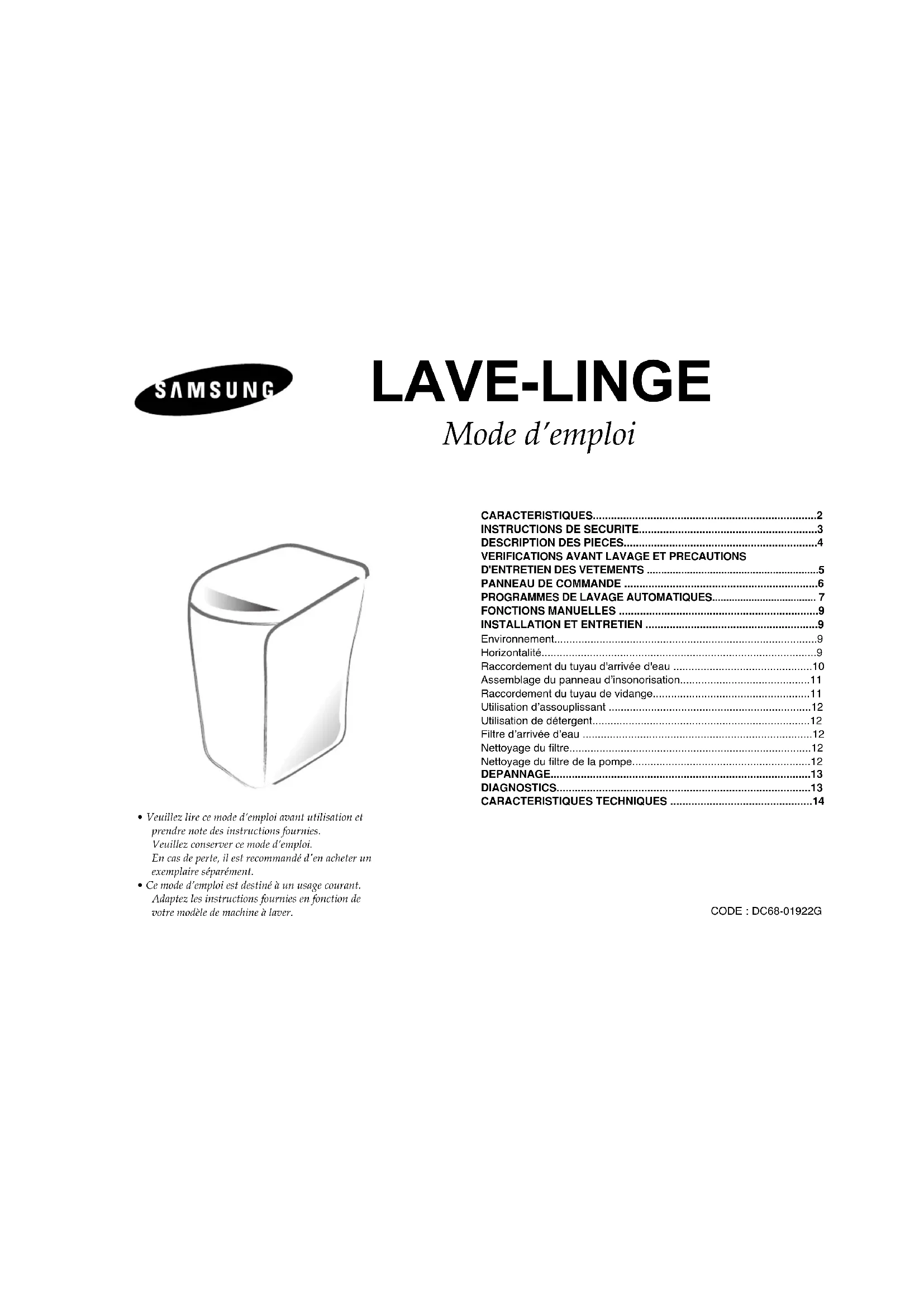 - Ce mode d’emploi est destiné à un usage courant. Adaptez les instructions fournies en fonction de votre modèle de machine à laver. CARACTERISTIQUES..........................................................................2