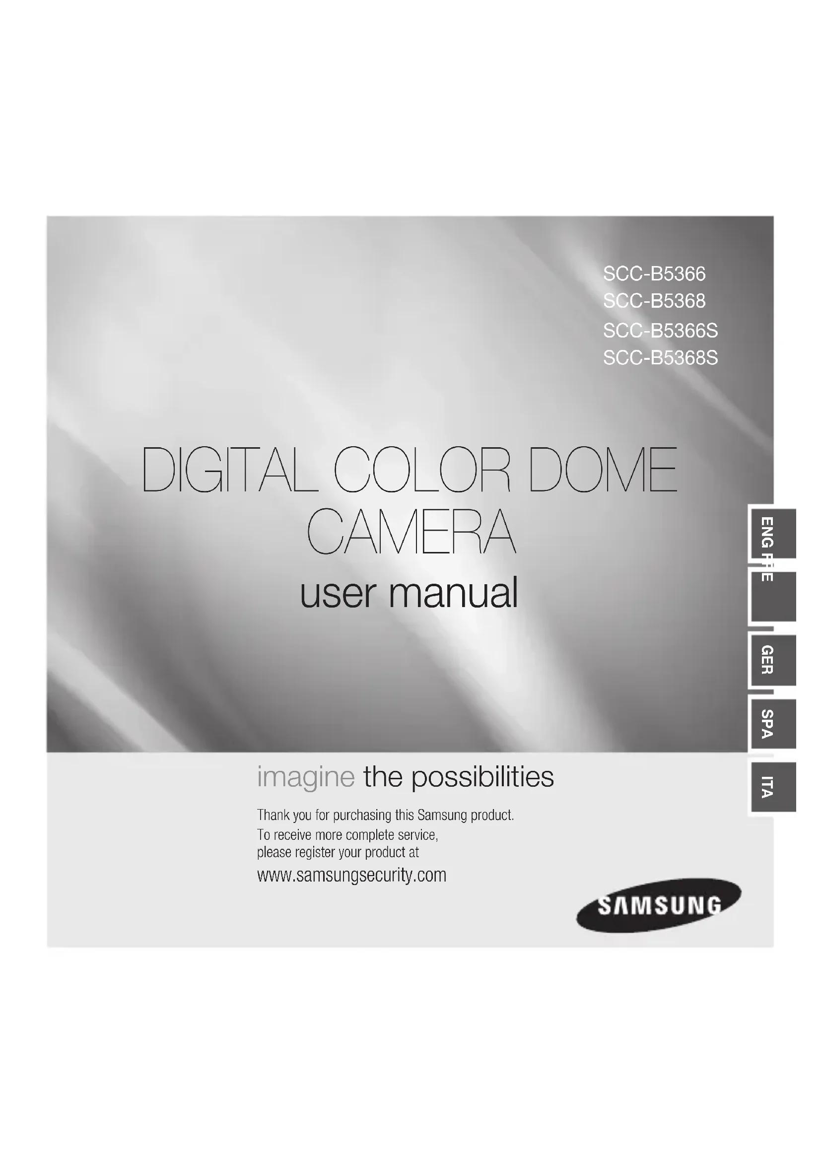 Eléments Sous-éléments SCC-B5366P/SCC-B5366SP/SCC-B5368P/SCC-B5368SP AGC Off/On (Réglage de niveau maxi) Verrouil. ligne Off/On (Contrôle de phase) ID de caméra Off/On (54 ea/2 lignes maxi) Bal Blancs BA1/BA1/BM/3200K/5600K DNR (Réduction du bruit numérique) Off/On (Adaptation 3D+2D) Stabilisation d’image numérique (SIN) Off/On Vidéo intelligente Fixe/Déplacé, Barrière Fonction Etc. Détail, Inverse(H/V), Posi/Nega Résolution Horizontale 600 lignes TV Verticale 350 lignes TV Sortie vidéo - Flux vidéo 1,0 Vp-p, 75 Ω Rapport signal/bruit Rapport signal/bruit Environ 52 dB Objectif Type lecteur objectif Diaphragme automatique (CC) SCC-B5366 : longueur focale = 2,5 à 6,0 mm / ouverture relative = F 1.2 SCC-B5368 : longueur focale = 2,8 à 11,0 mm / ouverture relative = F 1.2 Panoramique horizontal Plage 0 ~ 355°(100° dans le sens des aiguilles d’une montre), 255° (dans le sens inverse des aiguilles d’une montre) Panoramique vertical Plage 0 ~ 90° Télécommande Coaxitron (données sur câble coaxial) Oui (avec SCX-RD100) Conditions ambiantes Température de fonctionnement -10˚C ~ +50˚C Taux d’humidité Moins de 90 % Alimentation Puissance requise AC 24 V ± 10 %(50 Hz ± 0,3 Hz) DC 12 V ± 10 % Consommation d’énergie 2.3W Caractéristiques physiques Dimensions (Ø x H) 128(Ø) x 91(H)mm Poids 330g Couleur SCC-B5366/SCC-B5368 : blanc SCC-B5366S/SCC-B5368S : ArgentLes bons gestes de mise au rebut de ce produit (Déchets d’équipements électriques et électroniques) (Applicable dans les pays de l’Union Européenne et dans d’autres pays européens pratiquant le tri sélectif) Ce symbole sur le produit, ses accessoires ou sa documentation indique que ni le produit, ni ses accessoires électroniques usagés (chargeur, casque audio, câble USB, etc.) ne peuvent être jetés avec les autres déchets ménagers. La mise au rebut incontrôlée des déchets présentant des risques environnementaux et de santé publique, veuillez séparer vos produits et accessoires usagés des autres déchets. Vous favoriserez ainsi le recyclage de la matière qui les compose dans le cadre d’un développement durable. Les particuliers sont invités à contacter le magasin leur ayant vendu le produit ou à se renseigner auprès des autorités locales pour connaître les procédures et les points de collecte de ces produits en vue de leur recyclage. Les entreprises et professionnels sont invités à contacter leurs fournisseurs et à consulter les conditions de leur contrat de vente. Ce produit et ses accessoires ne peuvent être jetés avec les autres déchets professionnels et commerciaux.DIGITALE FARBBILD- KUPPELKAMERA Benutzerhandbuch SCC-B5366 SCC-B5368 SCC-B5366S SCC-B5368S Erleben Sie die Möglichkeiten Danke, dass Sie sich für dieses Produkt von Samsung entschieden haben. Um den vollständigen Service zu erhalten, registrieren Sie Ihr Produkt unter www.samsungsecurity.com