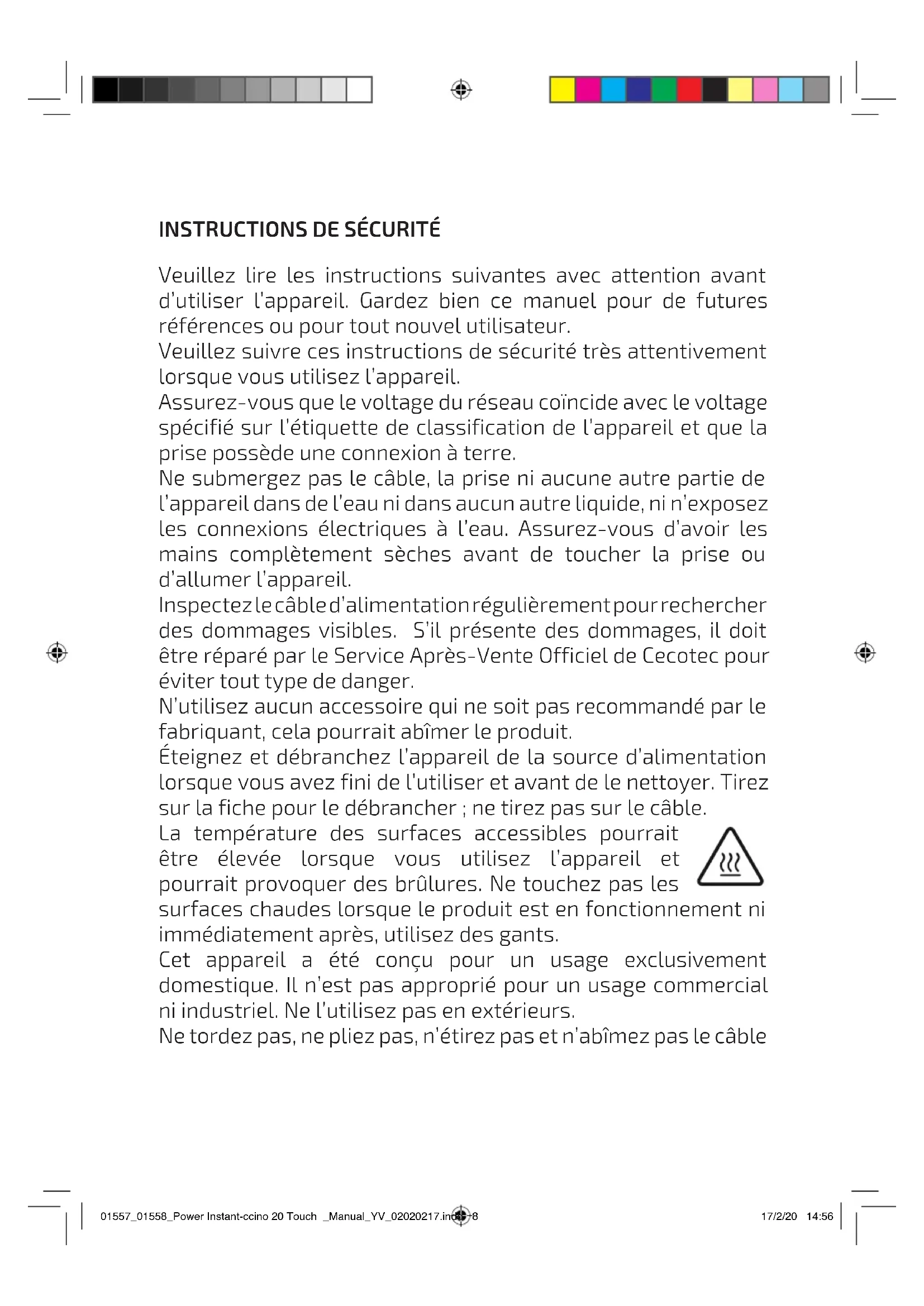 to its commercialization with the aim of ensuring its correct operating. After the quality control testing, the appliance is cleaned thoroughly, therefore, there could be rests of water drops or coffee in its inner parts. 01557_01558_Power Instant-ccino 20 Touch _Manual_YV_02020217.indd 701557_01558_Power Instant-ccino 20 Touch _Manual_YV_02020217.indd 7 17/2/20 14:5617/2/20 14:56INSTRUCTIONS DE SÉCURITÉ Veuillez lire les instructions suivantes avec attention avant d’utiliser l’appareil. Gardez bien ce manuel pour de futures références ou pour tout nouvel utilisateur. Veuillez suivre ces instructions de sécurité très attentivement lorsque vous utilisez l’appareil. Assurez-vous que le voltage du réseau coïncide avec le voltage spécifié sur l’étiquette de classification de l’appareil et que la prise possède une connexion à terre. Ne submergez pas le câble, la prise ni aucune autre partie de l’appareil dans de l’eau ni dans aucun autre liquide, ni n’exposez les connexions électriques à l’eau. Assurez-vous d’avoir les mains complètement sèches avant de toucher la prise ou d’allumer l’appareil. Inspectez le câble d’alimentation régulièrement pour rechercher des dommages visibles. S’il présente des dommages, il doit être réparé par le Service Après-Vente Officiel de Cecotec pour éviter tout type de danger. N’utilisez aucun accessoire qui ne soit pas recommandé par le fabriquant, cela pourrait abîmer le produit. Éteignez et débranchez l’appareil de la source d’alimentation lorsque vous avez fini de l’utiliser et avant de le nettoyer. Tirez sur la fiche pour le débrancher ; ne tirez pas sur le câble. La température des surfaces accessibles pourrait être élevée lorsque vous utilisez l’appareil et pourrait provoquer des brûlures. Ne touchez pas les surfaces chaudes lorsque le produit est en fonctionnement ni immédiatement après, utilisez des gants. Cet appareil a été conçu pour un usage exclusivement domestique. Il n’est pas approprié pour un usage commercial ni industriel. Ne l’utilisez pas en extérieurs. Ne tordez pas, ne pliez pas, n’étirez pas et n’abîmez pas le câble 01557_01558_Power Instant-ccino 20 Touch _Manual_YV_02020217.indd 801557_01558_Power Instant-ccino 20 Touch _Manual_YV_02020217.indd 8 17/2/20 14:5617/2/20 14:56d’alimentation. Protégez-le des bords pointus et des sources de chaleur. Ne laissez pas le câble toucher des surfaces chaudes ni dépasser de la surface de travail ou du plan de travail. Placez l’appareil sur une surface sèche et stable. Assurez-vous que l’appareil soit correctement introduit dans l’appareil et que le couvercle soit fermé avant de le mettre en fonctionnement. Ne l’extrayez pas lorsque l’appareil est allumé. N’utilisez pas l’appareil dans les circonstances suivantes : Dans ou sur des cuisines électriques ou à gaz, dans des fours chauds ni près du feu. Sur des surfaces molles (comme les tapis) ou des surfaces desquelles l’appareil pourrait se renverser pendant utilisation. En extérieurs ou dans des endroits possédant des niveaux d’humidité élevés. Cet appareil n’a pas été conçu pour fonctionner à travers des minuteries ou systèmes de contrôle à distance externes. Ne laissez pas le produit sans surveillance. Assurez-vous que l’appareil soit éteint avant de retirer une de ses parties ou accessoires. L’appareil ne doit pas être utilisé par des enfants de 0 à 8 ans. Il peut être utilisé par des enfants de 8 ans et plus s’ils sont surveillés constamment. Cet appareil peut être utilisé par des personnes aux capacités physiques, mentales ou sensorielles réduites, ou sans expérience ni connaissances si elles sont surveillées et/ou ont reçu les informations nécessaires à sa correcte utilisation et qu’elles ont bien compris les risques qu’il implique. Surveillez les enfants pour vous assurer qu’ils ne jouent pas avec l’appareil. Une surveillance stricte est nécessaire si le produit est utilisé par ou à côté des enfants.