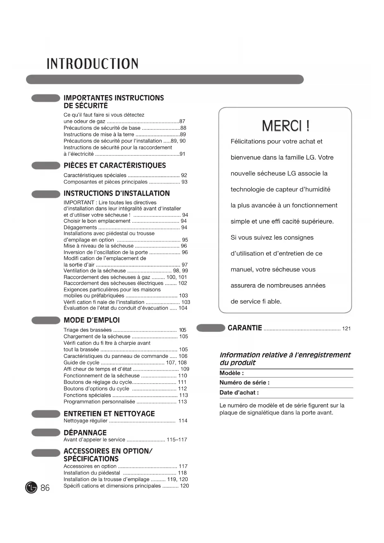 85Félicitations pour votre achat et bienvenue dans la famille LG. Votre nouvelle sécheuse LG associe la technologie de capteur d’humidité la plus avancée à un fonctionnement simple et une effi cacité supérieure. Si vous suivez les consignes d’utilisation et d’entretien de ce manuel, votre sécheuse vous assurera de nombreuses années de service fi able. MERCI !