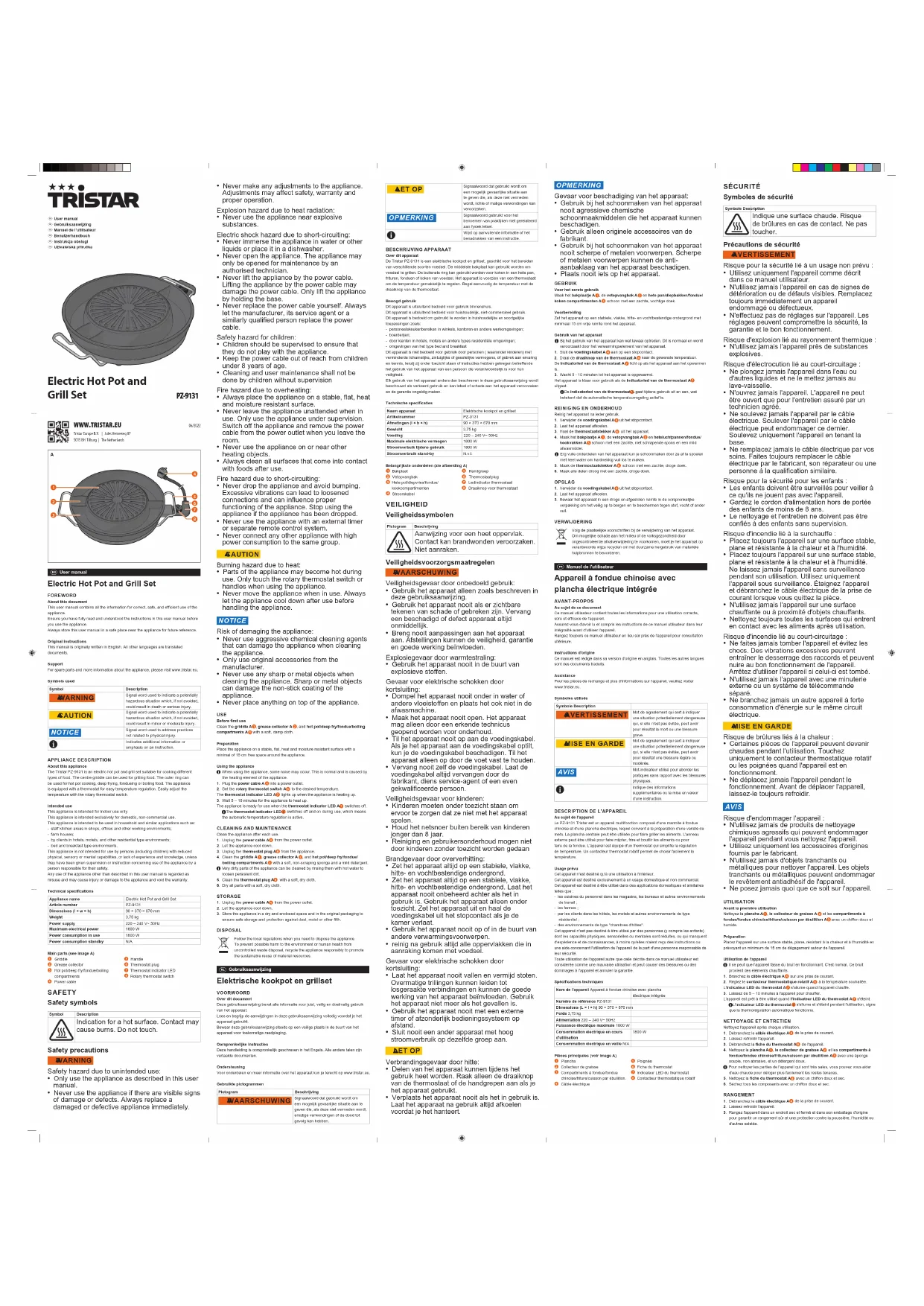 verpakking om het veilig op te bergen en te beschermen tegen stof, vocht of ander vuil.VERWIJDERINGVolg de plaatselijke voorschriften bij de verwijdering van het apparaat. Om mogelijke schade aan het milieu of de volksgezondheid door ongecontroleerde afvalverwijdering te voorkomen, moet je het apparaat op verantwoorde wijze recyclen om het duurzame hergebruik van materiële hulpbronnen te bevorderen. Manuel de l'utilisateur Appareil à fondue chinoise avec plancha électrique intégrée AVANT-PROPOSAu sujet de ce documentCe manuel utilisateur contient toutes les informations pour une utilisation correcte, sûre et efficace de l'appareil.Assurez-vous d'avoir lu et compris les instructions de ce manuel utilisateur dans leur intégralité avant d'utiliser l'appareil.Rangez toujours ce manuel utilisateur en lieu sûr près de l'appareil pour consultation ultérieure.Instructions d'origineCe manuel est rédigé dans sa version d'origine en anglais. Toutes les autres langues sont des documents traduits.AssistancePour les pièces de rechange et plus d'informations sur l'appareil, veuillez visiter www.tristar.eu.Symboles utilisésSymbole Description 6 AVERTISSEMENT Mot de signalement qui sert à indiquer une situation potentiellement dangereuse qui, si elle n'est pas évitée, peut avoir pour résultat la mort ou une blessure grave. 6