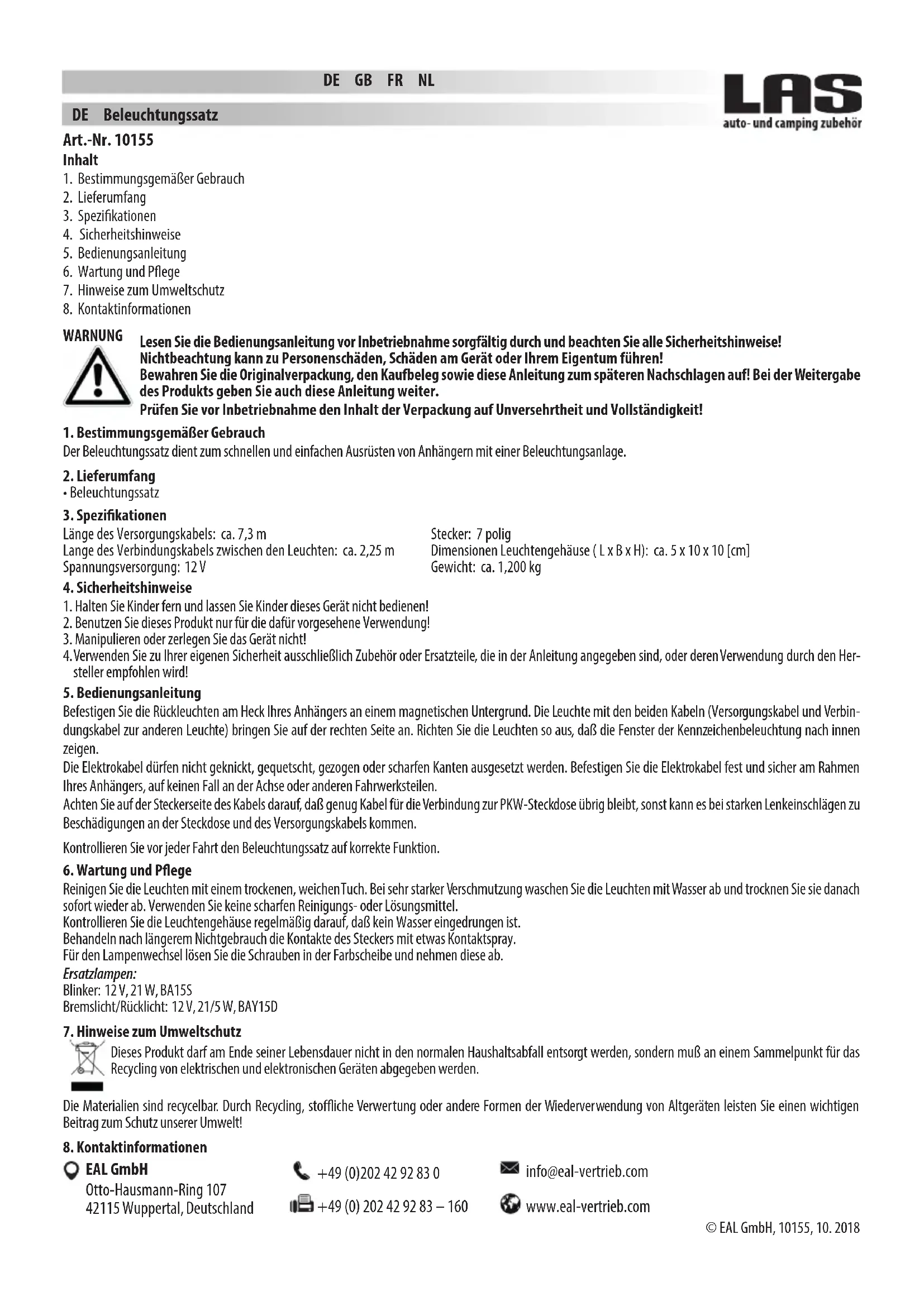 - Lighting set EAL GmbH Otto-Hausmann-Ring 107 42115 Wuppertal, Germany +49 (0)202 42 92 83 0 +49 (0) 202 42 92 83 – 160 info@eal-vertrieb.com www.eal-vertrieb.comFR Kit d‘éclairage Réf. 10155 AVERTISSEMENT Lisez attentivement la notice d‘utilisation avant la mise en service et respectez toutes les consignes de sécurité ! Conservez l‘emballage d‘origine, le justicatif d‘achat et la présente notice pour vous y référer ultérieurement ! Tout non-respect de ces consignes peut entraîner des dommages corporels, endommager l‘appareil ou vos biens ! Avant la mise en service, veuillez contrôler le contenu de l‘emballage quant à l‘absence de dommages et vérier si toutes les pièces sont présentes ! Le kit d‘éclairage permet un équipement rapide et simple des remorques avec un système d‘éclairage. Fixez les feux arrières à l‘arrière de votre remorque sur une surface magnétique. Installez la lampe avec les deux câbles (câble d‘alimentation et câble de raccord pour l‘autre lampe) sur le coté droit. Alignez les feux de manière à ce que les feux de la plaque d‘immatriculation soient orientés vers l‘intérieur. Les câbles électriques ne doivent pas être pliés, écrasés, étirés ou exposés à des bords tranchants. Fixez les câbles électriques sur le châssis de votre remorque, en aucun cas sur l‘essieu ou toute autre pièce du châssis. Assurez-vous qu‘il y ait assez de câble pour le branchement à la prise du camion, , dans le cas contraire, des dommages à la prise et au câble d‘alimentation pourraient survenir, en cas importants angles de braquages. Avant chaque déplacement, contrôlez le bon fonctionnement du kit d‘éclairage.