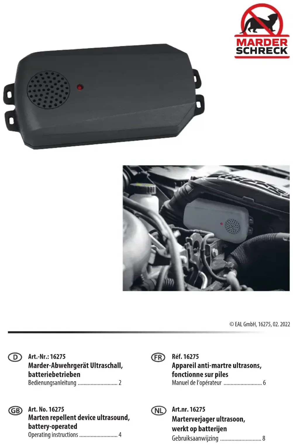 At the end of their lifetime, used batteries and battery packs are not to be disposed of in the household waste - or negligently in the environment. Hand in used device batteries/battery packs to the collection points at the store (dealer). This makes a considerable contribution towards protecting our environment. Some communities may also collect used batteries/battery packs via mobile stations or recycling centres.6 Tension de service : 3 V Fréquence : 23 kHz ± 10 % pulsatif Consommation électrique : 0,4 mA Angle de rayonnement : 160°, ecace Haut-parleur : piézo-calotte Pression acoustique: max. 95 dB ± 15 % Contrôle de fonctionnement: LED clignotant Type de pile : AA, pile mignon, 1,5 V Dimensions: env. 125 x 59 x 22 [mm] Poids: env. 0,065 kg (sans les piles) 1.UTILISATION CONFORME L‘appareil de défense à ultrason contre les martres, fonctionnant sur piles sert à la protection de dégâts provoqués par les martres sur les véhicules à moteur et les camping-cars. Cet appareil n‘est pas destiné à être utilisé par des enfants ou des personnes mentalement lésées ou ne disposant pas de l‘expérience ou des connaissances nécessaires. Les enfants doivent rester à distance de cet appareil. L‘appareil n‘est pas destiné à une utilisation industrielle ou commerciale. L‘utilisation conforme aux prescriptions implique également le respect de toutes les informations contenues dans ce mode d‘emploi, en particulier le respect des consignes de sécurité. Toute autre utilisation est considérée comme non conforme et risque d‘entraîner des dommages matériels ou corporels. EAL GmbH décline toute responsabilité pour les dommages résultant d‘une utilisation non conforme. AVERTISSEMENT Lisez attentivement la notice d‘utilisation avant la mise en service et respectez toutes les consignes de sécurité! Tout non-respect de ces consignes peut entraîner des dommages corporels, endom- mager l‘appareil ou vos biens! Conservez l‘embal- lage d‘origine, le justicatif d‘achat et la présente notice pour vous y référer ultérieurement ! Si vous revendez ou remettez le produit à des tiers, veuillez également leur remettre cette notice d‘utilisation. Avant la mise en service, vériez que le contenu de l‘emballage n‘est pas endommagé et vériez si toutes les pièces sont présentes!