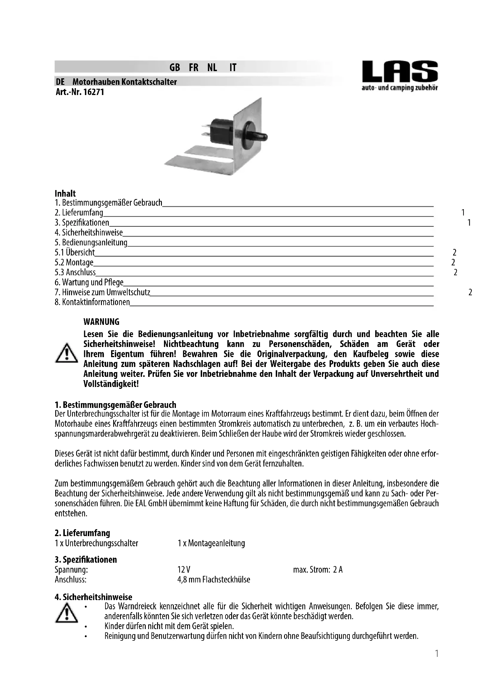 L’interrupteur de contact de capot est conçu pour être monté dans le compartiment moteur d’un véhicule. Il sert à interrom- pre un certain circuit automatiquement à l‘ouverture du capot d’un véhicule, par ex. pour désactiver un appareil de défense anti-martres haute tension. Le circuit sera à nouveau fermé une fois le capot fermé. Cet appareil n‘est pas destiné à être utilisé par des enfants ou des personnes aux capacités mentales limitées ou ne disposant pas de l‘expérience ou des connaissances nécessaires. Les enfants doivent rester à distance de cet appareil. L‘utilisation conforme aux prescriptions implique également le respect de toutes les informations contenues dans cette notice d‘utilisation, en particulier le respect des consignes de sécurité. Toute autre utilisation est considérée comme non conforme et peut entraîner des dommages matériels ou corporels. La société EAL GmbH décline toute responsabilité en cas de dommages découlant d’une utilisation non conforme à l’emploi prévu. AVERTISSEMENT Lisez attentivement la notice d‘utilisation avant la mise en service et respectez toutes les consignes de sécurité ! Tout non-respect de ces consignes peut entraîner des dommages corporels, endommager l‘ap- pareil ou vos biens ! Conservez l‘emballage d‘origine, le justicatif d‘achat et la présente notice pour vous y référer ultérieurement ! Si vous revendez ou remettez l‘appareil à des tiers, veuillez également leur remettre cette notice d‘utilisation. Avant la mise en service, veuillez contrôler le contenu de l‘emballage quant à l‘absence de dommages et vérier si toutes les pièces sont présentes ! 1 x Interrupteur de contact de capot 1 x Instructions de montage