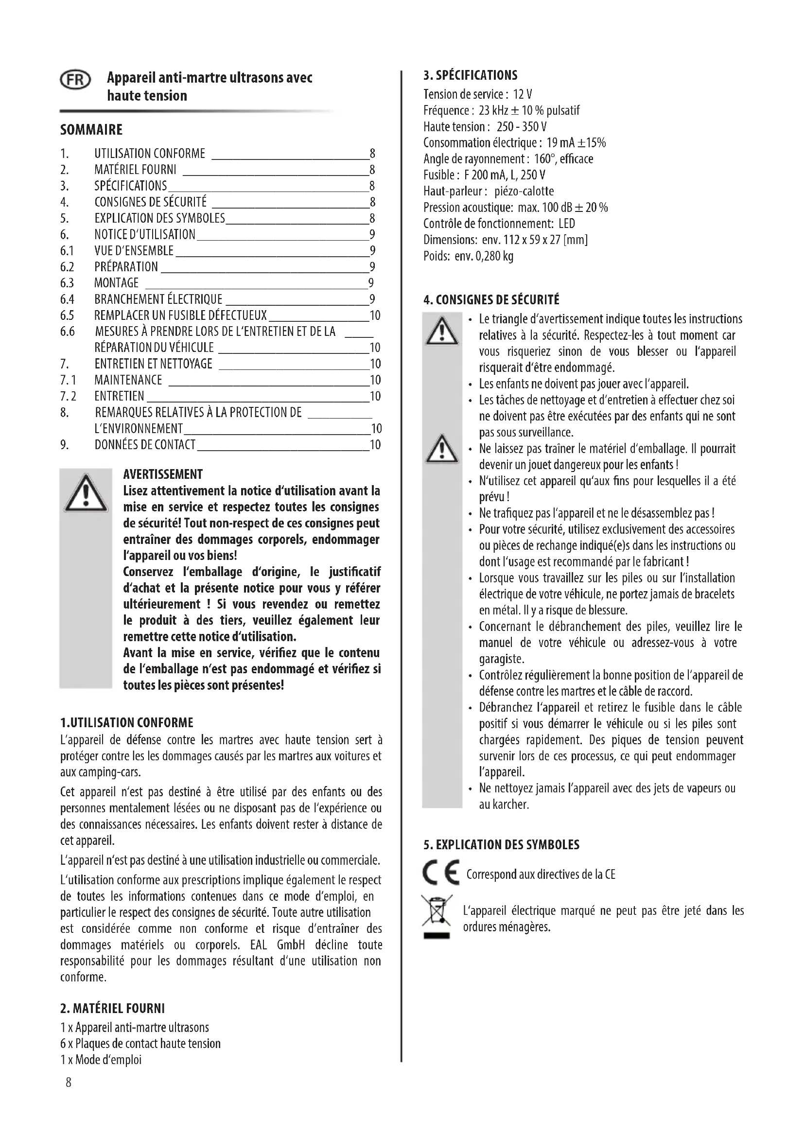 Keep the bare surfaces of the contact plates clean. Use a soft, maximally damp cloth for this purpose. Do not use any sharp cleaners or cleaners containing solvents. The frequency of cleaning depends on the weather, season and road surface. the road surface. Replace the fuse after completing the work.8 Tension de service : 12 V Fréquence : 23 kHz ± 10 % pulsatif Haute tension : 250 - 350 V Consommation électrique : 19 mA ±15% Angle de rayonnement : 160°, ecace Fusible : F 200 mA, L, 250 V Haut-parleur : piézo-calotte Pression acoustique: max. 100 dB ± 20 % Contrôle de fonctionnement: LED Dimensions: env. 112 x 59 x 27 [mm] Poids: env. 0,280 kg 1.UTILISATION CONFORME L‘appareil de défense contre les martres avec haute tension sert à protéger contre les les dommages causés par les martres aux voitures et aux camping-cars. Cet appareil n‘est pas destiné à être utilisé par des enfants ou des personnes mentalement lésées ou ne disposant pas de l‘expérience ou des connaissances nécessaires. Les enfants doivent rester à distance de cet appareil. L‘appareil n‘est pas destiné à une utilisation industrielle ou commerciale. L‘utilisation conforme aux prescriptions implique également le respect de toutes les informations contenues dans ce mode d‘emploi, en particulier le respect des consignes de sécurité. Toute autre utilisation est considérée comme non conforme et risque d‘entraîner des dommages matériels ou corporels. EAL GmbH décline toute responsabilité pour les dommages résultant d‘une utilisation non conforme. AVERTISSEMENT Lisez attentivement la notice d‘utilisation avant la mise en service et respectez toutes les consignes de sécurité! Tout non-respect de ces consignes peut entraîner des dommages corporels, endommager l‘appareil ou vos biens! Conservez l‘emballage d‘origine, le justicatif d‘achat et la présente notice pour vous y référer ultérieurement ! Si vous revendez ou remettez le produit à des tiers, veuillez également leur remettre cette notice d‘utilisation. Avant la mise en service, vériez que le contenu de l‘emballage n‘est pas endommagé et vériez si toutes les pièces sont présentes!