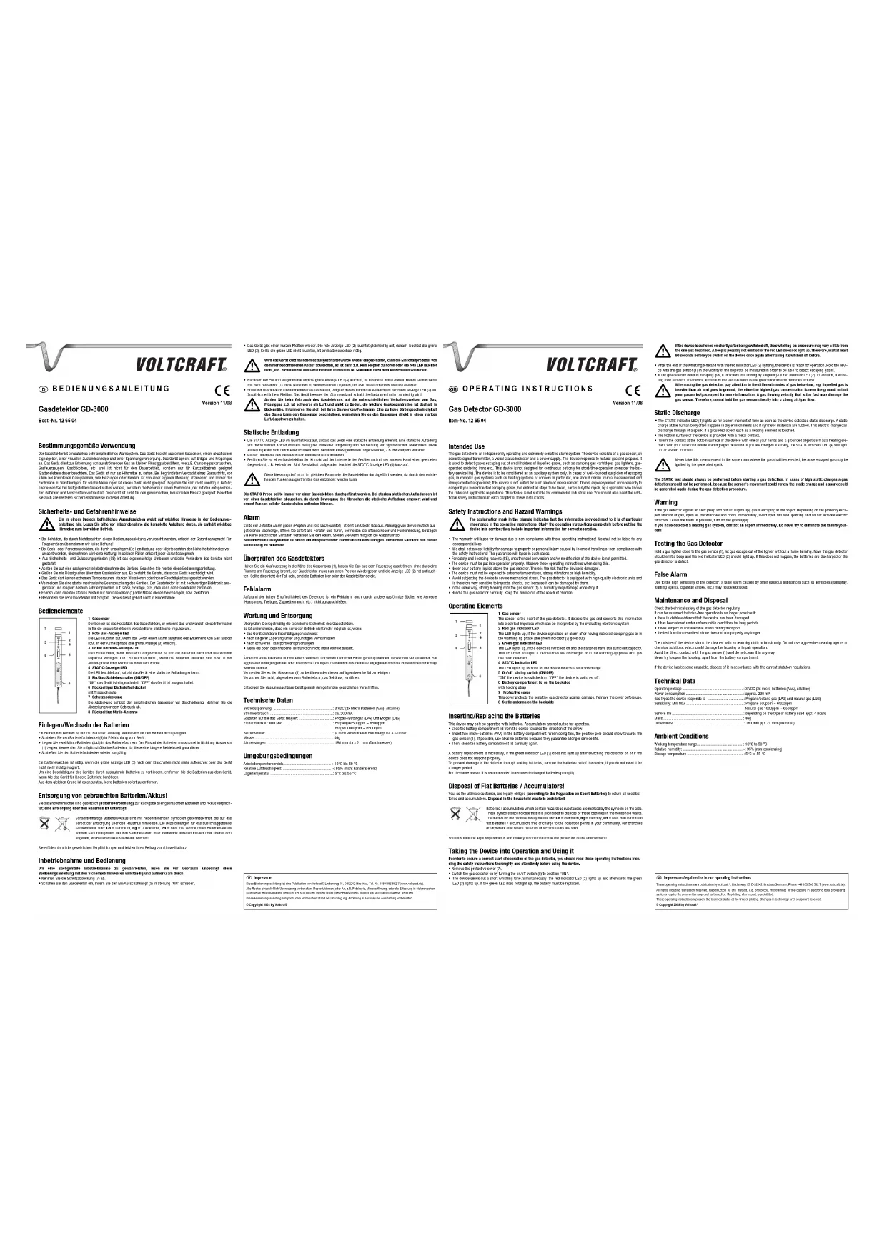 - Avant de mesurer des fuites de gaz, toucher le dessous de l'appareil d'une main et p.ex. un radiateur de l'autre main. Si le corps a une charge statique, la DEL de signalisation STATIC (4) s'allume brièvement. Cette vérification ne doit pas s'effectuer dans la même pièce que celle où est soupçonnée la fuite de gaz, étantdonné que l'étincelle produite pourrait enflammer le gaz. L'essai STATIC doit être toujours réalisé avant une détection de gaz. En cas de fortes charges statiques, éviter de pro- céder à une mesure du gaz, car cette charge statique est en permanence renouvelée par le déplacement des person-nes, avec de possible production d'étincelles.Alarme Quand le détecteur déclenche une alarme (signal acoustique et allumage de la DEL rouge), il y a fuite de gaz. Selon la quan- tité supposée du gaz, ouvrir immédiatement toutes les fenêtres et toutes les portes, éviter les foyers ouverts et la formation d'étincelles, n'actionner aucun interrupteur électrique. Quitter la pièce. Couper si possible l'alimentation de gaz. En cas de fuites dans des systèmes à gaz, un spécialiste doit être immédiatement contacté. Ne pas essayer de repa-rer soi-même la panne.Vérification du détecteur de gaz Tenir un briquet à gaz à proximité du détecteur (1), laisser du gaz s'échapper sans l'allumer avec le briquet; le détecteur de gaz doit émettre un signal acoustique et la DEL de signalisation rouge (2) doit s'allumer. Dans le cas contraire, les piles sont déchargées ou le détecteur de gaz est défectueux.Fausse alarme En raison de la haute sensibilité du détecteur, une fausse alarme provoquée par d'autres substances gazeuses comme les aérosols (sprays pour cheveux, propulseurs à gaz , fumée de cigarettes, etc.) ne peut être exclue.Entretien et élimination des éléments usésContrôler régulièrement la sécurité technique du détecteur de gaz.Un fonctionnement approprié n’est plus assuré lorsque :• l’appareil est visiblement endommagé,• l'appareil a été stocké pendant une période prolongée dans des conditions déplorables,• suite à de fortes contraintes durant le transport,• quand la fonction de test décrite plus haut ne se déroule plus correctement. L’extérieur de l’appareil doit être uniquement nettoyé avec un chiffon sec et doux ou un pinceau. N’utiliser en aucun cas des nettoyants agressifs ou des solutions chimiques car ces produits attaquent le boîtier ou peuvent nuire au bon fonctionnement de l’appareil.Evitez d'une manière ou d'une autre de toucher le capteur de gaz (1) ou de le nettoyer.N'essayez pas d'ouvrir le boîtier, à l'exception du logement des piles. Si l'appareil est devenu inutilisable, il convient de procéder à son élimination conformément aux prescriptions légales en vigueur.Caractéristiques techniques Tension de service ..........................................................: 3 VDC (2x piles Micro (AAA), alcalines) Consommation électrique ................................................: env. 200 mA Gaz auxquels l'appareil réagit ..........................................: Propane/butane (GPL) et gaz naturel (GNL) Sensibilité: Min Max.........................................................: Propane 500ppm ~ 6500ppmGaz naturel 1000ppm ~ 6500ppm Durée de service ..............................................................: env. 4 heures selon le type de piles utilisé Masse..............................................................................: 46gDimensions .....................................................................: 180 mm (L) x 21 mm (diamètre)Conditions ambiantesPlage de température de service ......................................: 10°C à 50 °CHumidité relative de l’air: .................................................< 95% (sans condensation)Température de stockage.................................................: 5°C à 55 °CInformations /légales dans nos modes d'emploiCe mode d'emploi est une publication de la société Voltcraft , Lindenweg 15, D-92242 Hirschau/Allemagne, Tél. +49 180/586 582 7(www.voltcraft.de). Tous droits réservés, y compris de traduction. Toute reproduction, quelle qu'elle soit (p. ex. photocopie, microfilm, saisie dans des installations de traitement de données) nécessite une autorisation écrite de l'éditeur. Il est interdit de le réimprimer, même par extraits. Ce mode d'emploi correspond au niveau technique du moment de la mise sous presse. Sous réserve de modifications techniques et de l'équipement. © Copyright 2008 by Voltcraft 01_1108_02/CD