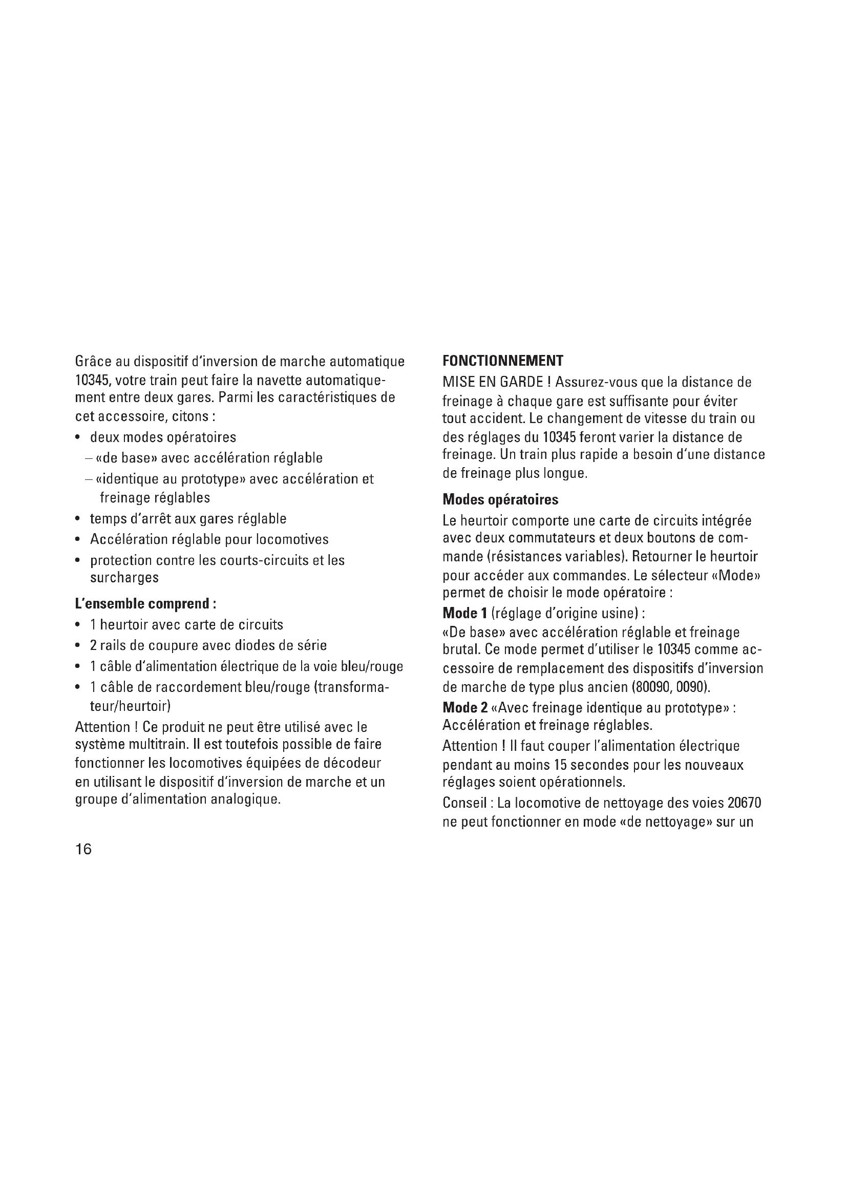 - 1 câble de raccordement bleu/rouge (transforma- teur/heurtoir) Attention ! Ce produit ne peut être utilisé avec le système multitrain. Il est toutefois possible de faire fonctionner les locomotives équipées de décodeur en utilisant le dispositif d‘inversion de marche et un groupe d‘alimentation analogique. FONCTIONNEMENT MISE EN GARDE ! Assurez-vous que la distance de freinage à chaque gare est suffisante pour éviter tout accident. Le changement de vitesse du train ou des réglages du 10345 feront varier la distance de freinage. Un train plus rapide a besoin d‘une distance de freinage plus longue. Modes opératoires Le heurtoir comporte une carte de circuits intégrée avec deux commutateurs et deux boutons de com- mande (résistances variables). Retourner le heurtoir pour accéder aux commandes. Le sélecteur «Mode» permet de choisir le mode opératoire : Mode 1 (réglage d’origine usine) : «De base» avec accélération réglable et freinage brutal. Ce mode permet d’utiliser le 10345 comme ac- cessoire de remplacement des dispositifs d’inversion de marche de type plus ancien (80090, 0090). Mode 2 «Avec freinage identique au prototype» : Accélération et freinage réglables. Attention ! Il faut couper l’alimentation électrique pendant au moins 15 secondes pour les nouveaux réglages soient opérationnels. Conseil : La locomotive de nettoyage des voies 20670 ne peut fonctionner en mode «de nettoyage» sur un17 réseau raccordé à un dispositif d’inversion de marche