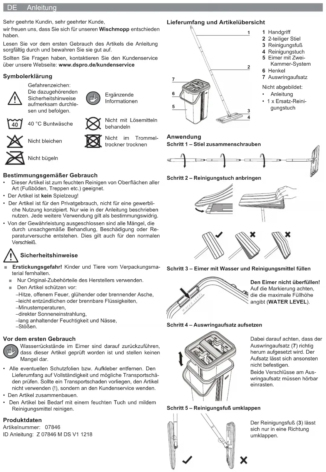 - Si nécessaire, nettoyez l’article avec un chiffon humide et un peu de détergent doux. Caractéristiques du produit Réf. d‘article: 07846 ID mode d‘emploi: Z 07846 M DS V1 1218 Composition et vue générale de l’article 1 Poignée 2 Manche en deux parties 3 Pied de nettoyage 4 Lingette de net- toyage 5 Seau avec système à deux bacs 6 Anse 7 Essoreuse Non illustrés :