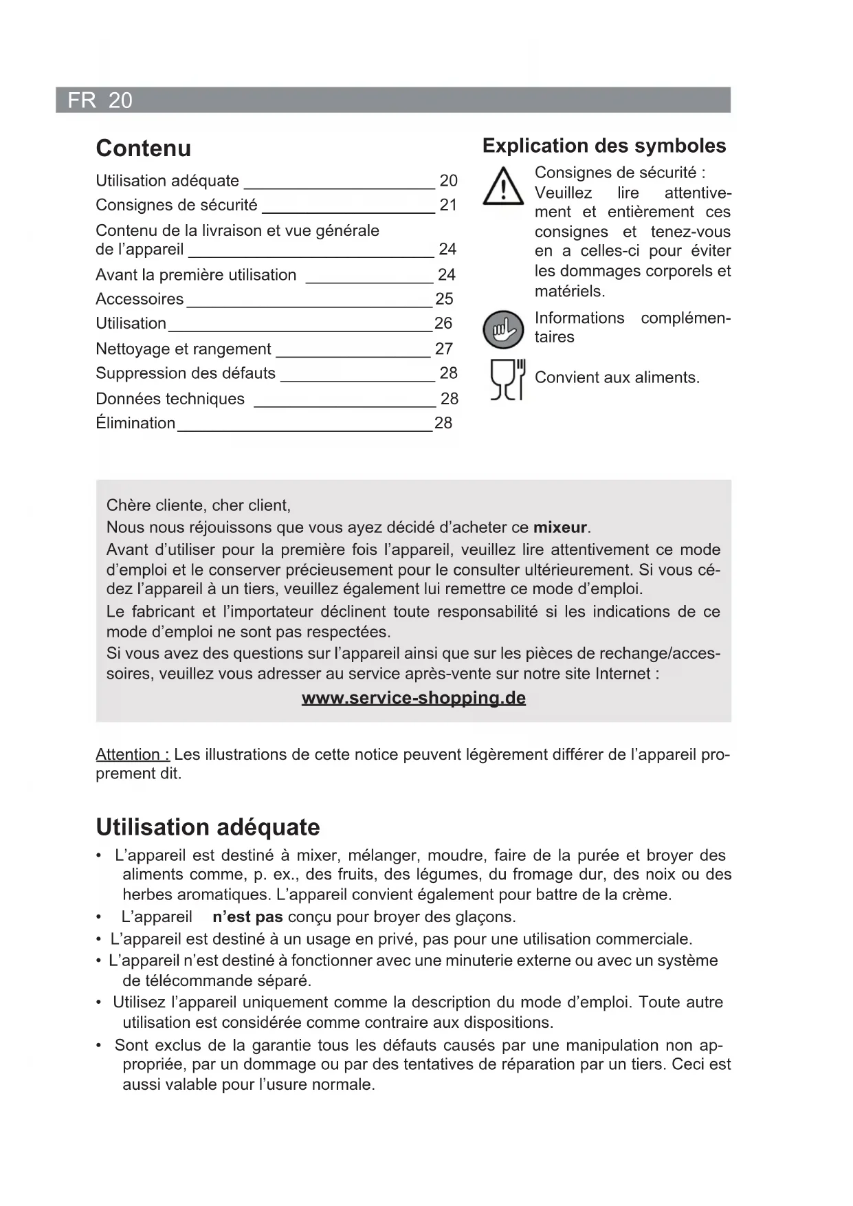 - Sont exclus de la garantie tous les défauts causés par une manipulation non ap- propriée, par un dommage ou par des tentatives de réparation par un tiers. Ceci est aussi valable pour l’usure normale. Explication des symboles Consignes de sécurité : Veuillez lire attentive- ment et entièrement ces consignes et tenez-vous en a celles-ci pour éviter les dommages corporels et matériels. Informations complémen- taires Convient aux aliments. Chère cliente, cher client, Nous nous réjouissons que vous ayez décidé d’acheter ce mixeur. Avant d’utiliser pour la première fois l’appareil, veuillez lire attentivement ce mode d’emploi et le conserver précieusement pour le consulter ultérieurement. Si vous cé- dez l’appareil à un tiers, veuillez également lui remettre ce mode d’emploi. Le fabricant et l’importateur déclinent toute responsabilité si les indications de ce mode d’emploi ne sont pas respectées. Si vous avez des questions sur l’appareil ainsi que sur les pièces de rechange/acces- soires, veuillez vous adresser au service après-vente sur notre site Internet : www.service-shopping.de Contenu Utilisation adéquate _____________________ 20 Consignes de sécurité ___________________ 21 Contenu de la livraison et vue générale de l’appareil ___________________________ 24 Avant la première utilisation ______________ 24 Accessoires ___________________________ 25 Utilisation _____________________________ 26 Nettoyage et rangement _________________ 27 Suppression des défauts _________________ 28 Données techniques ____________________ 28 Élimination ____________________________ 2821 FR Consignes de sécurité Risques de blessure ■ Risque d’asphyxie ! Tenez les enfants et les animaux éloignés du matériel d’emballage. ■ Cet appareil peut être utilisé par des personnes ayant des ca- pacités physiques, sensorielles ou mentales réduites ou ayant un manque d’expérience et/ou de connaissance si elles sont surveillées ou si elles ont reçu des instructions pour utiliser l’ap- pareil en toute sécurité et qu’elles ont compris les dangers en résultant. Il est interdit aux enfants de jouer avec l’appareil. ■ Les enfants et les animaux doivent être tenus éloignés de l’ap- pareil et du câble d’alimentation ! Rangez l’appareil de manière inaccessible pour les enfants et les animaux ! ■ Risque de blessure avec les lames coupantes ! Les lames sont coupantes ! Soyez prudent en manipulant les lames en croix afi n d’éviter toute blessure par coupure. ■ En l’absence de surveillance, avant l’assemblage, avant le dé- montage ou le nettoyage, il faut toujours débrancher la prise électrique de l’appareil. ■ Risque de brûlure ! Ne remplissez jamais l’appareil avec des aliments ou des liquides brûlants ! Le contenu ne doit jamais dépasser la température de 50 °C. ■ Veillez à ce que votre espace de travail soit bien illuminé lorsque vous utilisez l’appareil. Pour votre santé ■ L’appareil peut comporter des résidus de production. Afi n d’évi- ter des gênes pour la santé, veuillez le nettoyer à fond avant la première utilisation (voir chapitre « Nettoyage et rangement »). ■ Nettoyez les accessoires immédiatement après chaque usage, à fond et avec de l’eau chaude et un peu de liquide vaisselle pour éviter toute formation de bactéries. Ne laissez sécher au- cun reste d’aliment.FR 22 ■ Veuillez conserver les plats préparés dans le réfrigérateur. Ne mangez aucun aliment moisi et n’utilisez que des ingrédients frais dont la date limite de conservation n’est pas encore dé- passée. Risque d’électrocution et d’incendie ■ Utilisez l’appareil uniquement dans des locaux fermés. ■ Posez toujours l’appareil sur une surface sèche, plate et solide. ■ Gardez suffi samment de distance par rapport aux sources de chaleur comme par exemple des plaques chauffantes ou des fours. ■ Ne recouvrez jamais l’appareil avec des chiffons ou autres. Il y a risque de surchauffe ! ■ Ne posez pas l’appareil à proximité de matériaux facilement in- fl ammables (rideaux, textiles etc.). ■ Ne posez aucun objet facilement infl ammable comme p. ex. du papier, du carton ou du plastique dans ou sur l’appareil. ■ Ne plongez jamais le bloc-moteur dans de l’eau ou d’autres li- quides ! Assurez-vous que le bloc-moteur, le câble ou la fi che ne tombent pas dans l’eau ou ne peuvent pas devenir humides. ■ Si le bloc-moteur devait tomber dans l’eau, interrompez immé- diatement l’alimentation électrique. ■ Ne touchez jamais le bloc-moteur, le câble ou la fi che électrique lorsque vous avez les mains mouillées. ■ Branchez l’appareil uniquement à une prise électrique correc- tement installée et correspondant aux données techniques de l’appareil (voir chapitre « Données techniques ») ■ Veuillez disposer le câble de sorte que celui-ci ne soit pas plié, écrasé ou ne soit pas en contact avec des surfaces brûlantes. ■ Débranchez la prise électrique lorsque vous n’utilisez pas l’ap- pareil, lorsqu’une erreur survient pendant le fonctionnement ou avant un orage. ■ Lorsque vous souhaitez retirer la prise électrique, saisissez-la toujours au niveau de la prise et jamais par le câble.23 FR Attention aux dommages matériels et sur l’appareil ■ Vérifi ez avant chaque utilisation que l’appareil n’est pas en- dommagé. Lorsque le bloc-moteur, les accessoires, le câble d’alimentation ou la fi che électrique présentent des dommages visibles, il est interdit d’utiliser l’appareil. N’essayez pas de répa- rer l’appareil par vos propres soins ni de remplacer le câble ou la fi che électrique. Contactez immédiatement le service après- vente en cas de dommages. ■ Vérifi ez, avant chaque mise en service, que l’appareil est propre et sec ainsi que correctement assemblé et fermé. ■ N’utilisez aucun accessoire supplémenta