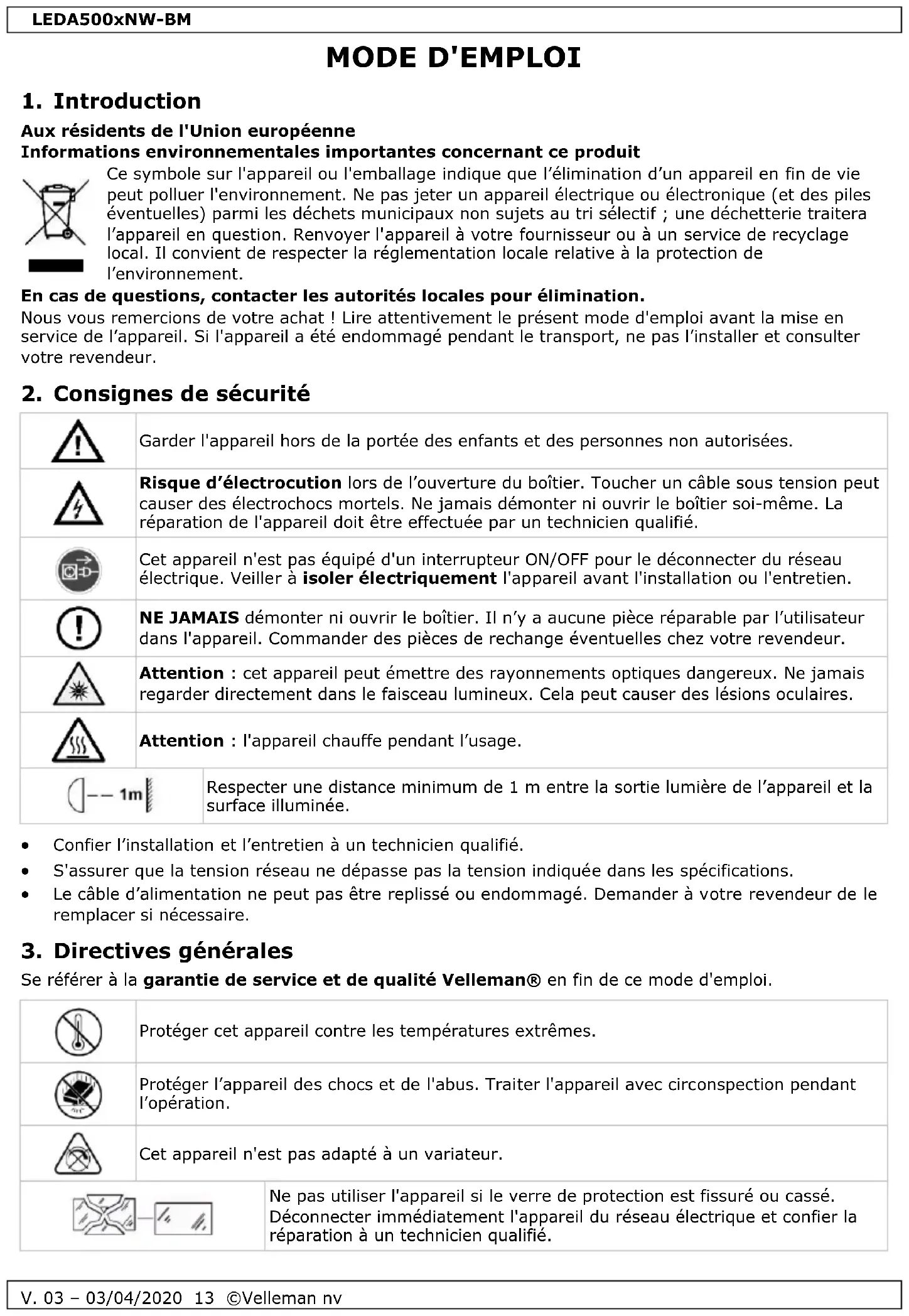 Velleman SA est l’ayant droit des droits d’auteur de ce mode d'emploi. Tous droits mondiaux réservés. Toute reproduction, traduction, copie ou diffusion, intégrale ou partielle, du contenu de ce mode d'emploi par quelque procédé ou sur tout support électronique que ce soit est interdite sans l’accord préalable écrit de l’ayant droit.LEDA500xNW-BM