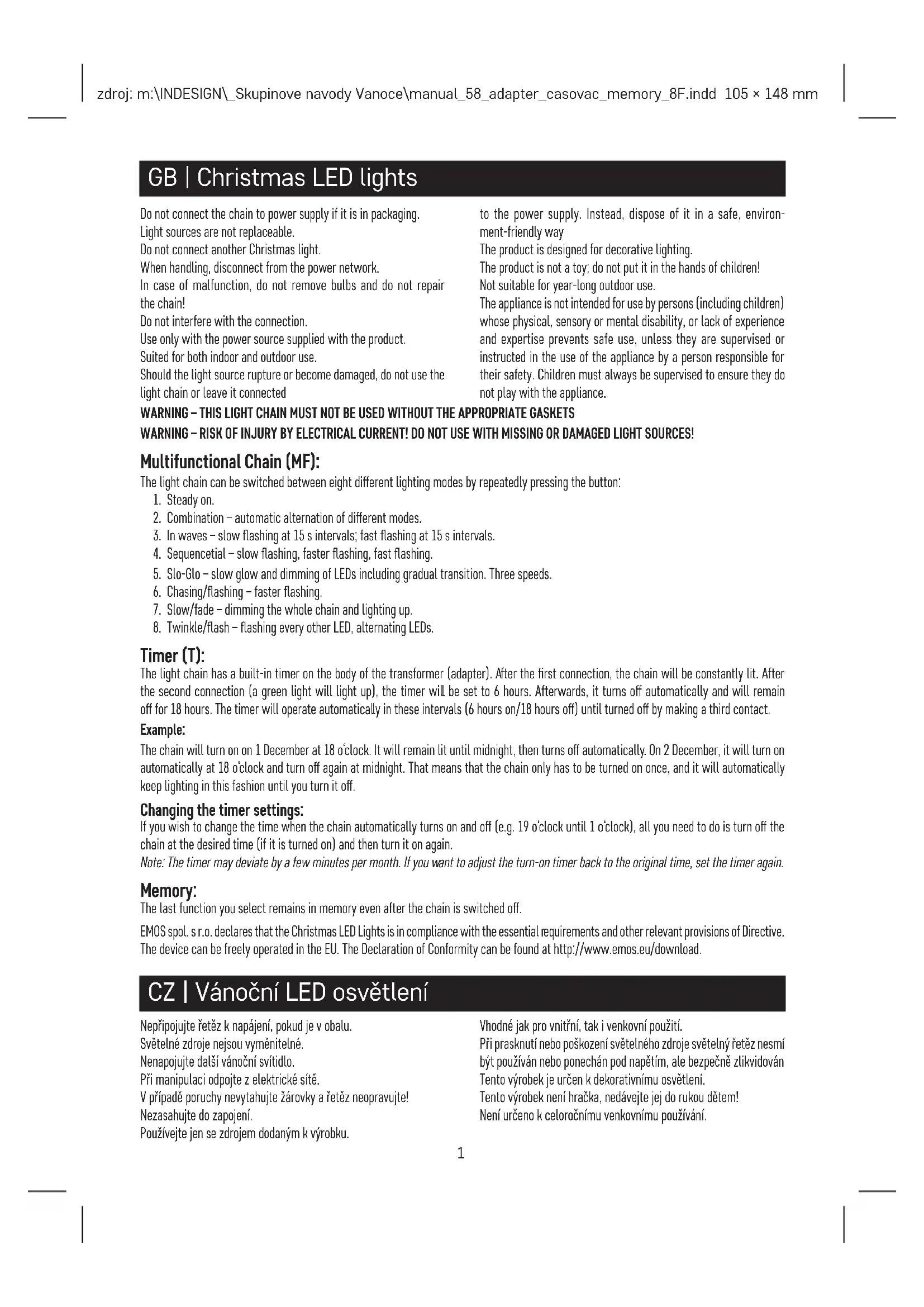 Minuterie (T) : La lumière chaîne a construit -dans minuterie sur le corps de la transformateur (adaptateur). Après la première connexion, la chaîne sera être constamment allumé Après la seconde connexion (vert clair sera la lumière vers le haut), la minuterie va être xée à 6 heures. Après, ça tourne o automatiquement et sera rester hors de 18 heures. La minuterie sera fonctionner automatiquement dans ces intervalles (6 heures sur/18 heures au large) jusqu‘à tourné au large en faisant un troisième contacts. Exemple : La chaîne se tourner sur le 1 Décembre à 18 heures. Il sera reste allumé jusqu‘à minuit, puis se éteint automatiquement. Le 2 Décembre, il se tourner sur automatiquement à 18 heures et tourner de nouveau à minuit. Que des moyens que la chaîne ne doit être mis sur une fois, et il sera automatiquement garder l‘ éclairage de cette façon jusqu‘à ce que vous mettez ce hors. Modication de la minuterie paramètres : Si vous le souhaitez pour changer le moment où la chaîne automatiquement se marche et arrêt (par exemple 19. Heures jusqu‘à 1 heures), tout vous devez faire est tour de la chaîne à la désirée du temps (si il est tourné sur) et puis tourner ce à nouveau. Remarque : la minuterie peut diérer de quelques minutes par mois. Si vous voulez pour régler le tour sur minuterie retour à l‘ origine du temps, réglez la minuterie à nouveau. Mémoire : La dernière fonction sélectionnée reste en mémoire même après la mise hors tension de la chaîne. EMOS spol. s r. o. déclare que les Luminaire de Noël LED est en conformité avec les essentiels exigences et autres pertinentes dispositions de la directive. L‘ appareil peut être utilisé librement dans l‘ UE. La déclaration de conformité peut être trouvé à http://www.emos.eu/download. IT | Luci di Natale con LED Non collegare la catena all‘alimentazione se è contenuta nell‘imballo. Le sorgenti luminose non sono sostituibili. Non collegare un‘altra luce di Natale. Durante la manipolazione, scollegare dalla rete di alimentazione. In caso di malfunzionamento, non rimuovere le lampadine e non riparare la catena! Non interferire con la connessione. Utilizzare solo con la fonte di alimentazione fornita con il prodotto. Adatto sia per interni che per esterni. Se la sorgente luminosa dovesse rompersi o danneggiarsi, non utilizzare la catena leggera o lasciarla collegata all‘alimentazione. Invece, smaltiscilo in modo sicuro e rispettoso dell‘ambiente. Il prodotto è progettato per l’illuminazione decorativa. Il prodotto non è un giocattolo; non metterlo nelle mani dei bambini! Non adatto per uso esterno per tutto l‘anno. Questo apparecchio non è destinato a essere usato da persone (compresi i bambini) la cui disabilità sica, sensoriale o mentale o la mancanza di esperienza e conoscenza impediscono loro l’uso sicuro dell’apparecchio, a meno che non siano supervisionate o istruite sull’uso dell’apparecchio da una persona responsabile della loro sicurezza. È necessario tenere d’occhio i bambini per assicurarsi che non giochino con l’apparecchio. ATTENZIONE – QUESTA CATENA LEGGERA NON DEVE ESSERE UTILIZZATA SENZA LE GUARNIZIONI APPROPRIATE! ATTENZIONE – RISCHIO DI LESIONI PER CORRENTE ELETTRICA! NON UTILIZZARE CON FONTI LUMINOSE MANCANTI O DANNEGGIATE! Catena multifunzionale (MF): La luce catena può essere commutato tra otto di erenti illuminazione modi dal ripetutamente premendo il pulsante: