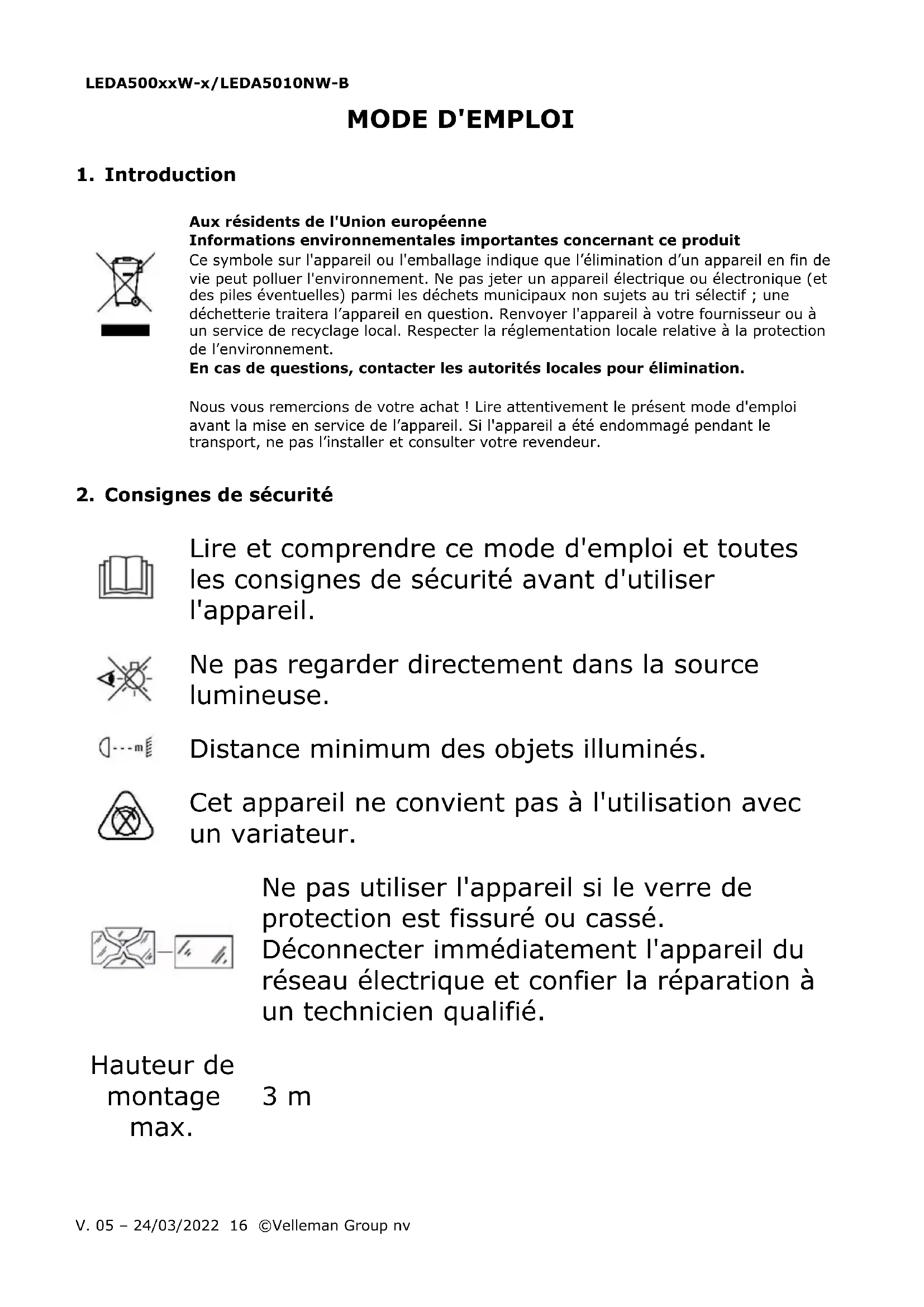 Velleman Group nv est l’ayant droit des droits d’auteur de ce mode d'emploi. Tous droits mondiaux réservés. Toute reproduction, traduction, copie ou diffusion, intégrale ou partielle, du contenu de ce mode d'emploi par quelque procédé ou sur tout support électronique que ce soit est interdite sans l’accord préalable écrit de l’ayant droit.LEDA500xxW-x/LEDA5010NW-B
