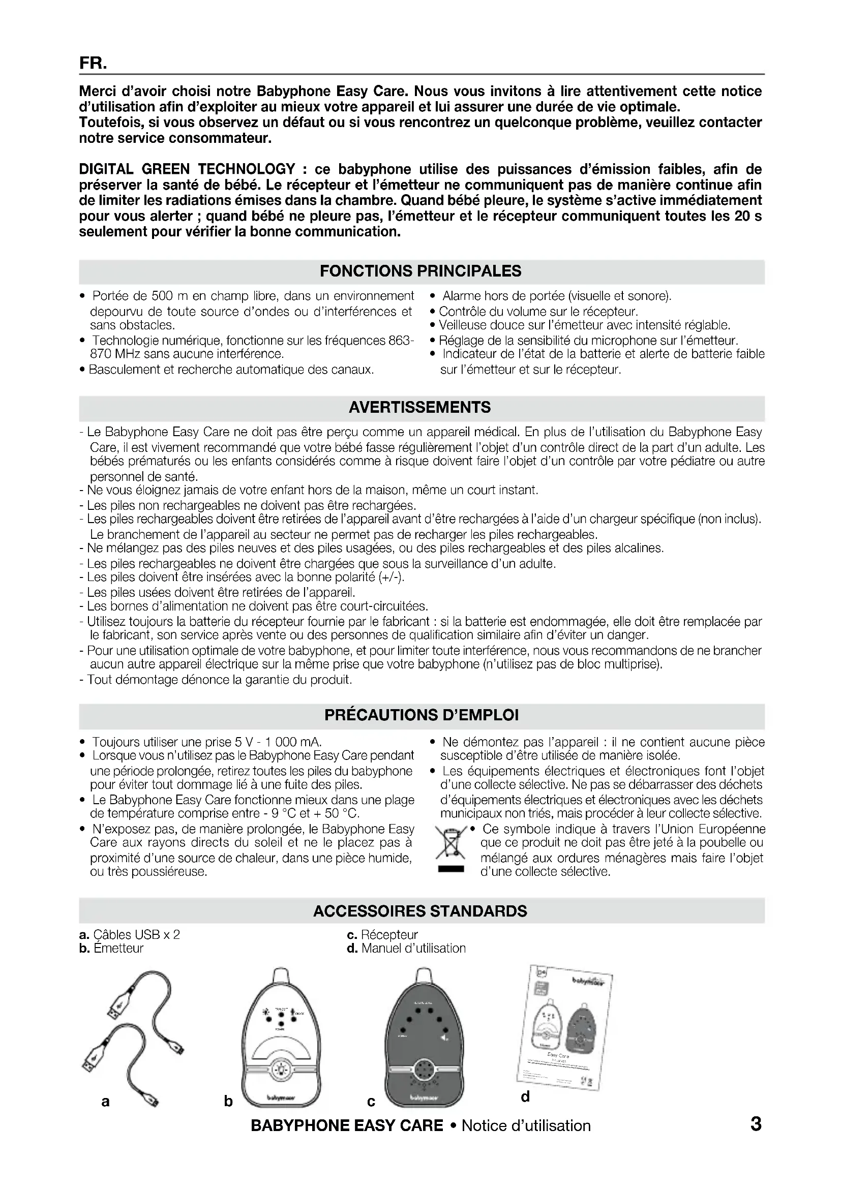 FR. Merci d’avoir choisi notre Babyphone Easy Care. Nous vous invitons à lire attentivement cette notice d’utilisation afin d’exploiter au mieux votre appareil et lui assurer une durée de vie optimale. Toutefois, si vous observez un défaut ou si vous rencontrez un quelconque problème, veuillez contacter notre service consommateur. DIGITAL GREEN TECHNOLOGY : ce babyphone utilise des puissances d’émission faibles, afin de préserver la santé de bébé. Le récepteur et l’émetteur ne communiquent pas de manière continue afin de limiter les radiations émises dans la chambre. Quand bébé pleure, le système s’active immédiatement pour vous alerter ; quand bébé ne pleure pas, l’émetteur et le récepteur communiquent toutes les 20 s seulement pour vérifier la bonne communication. FONCTIONS PRINCIPALES