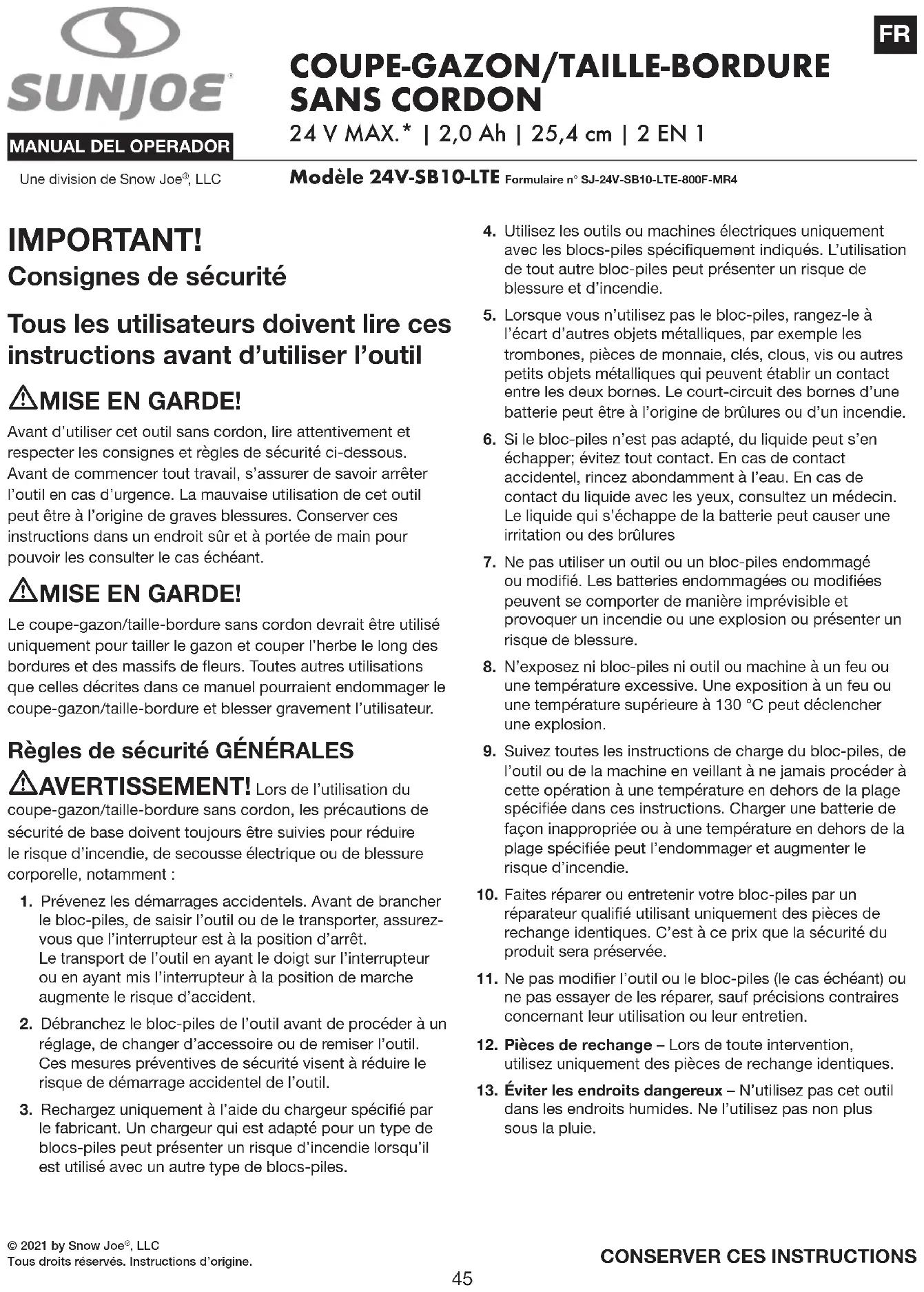 MODE D'EMPLOI 24VLAWNBDL Sun Joe