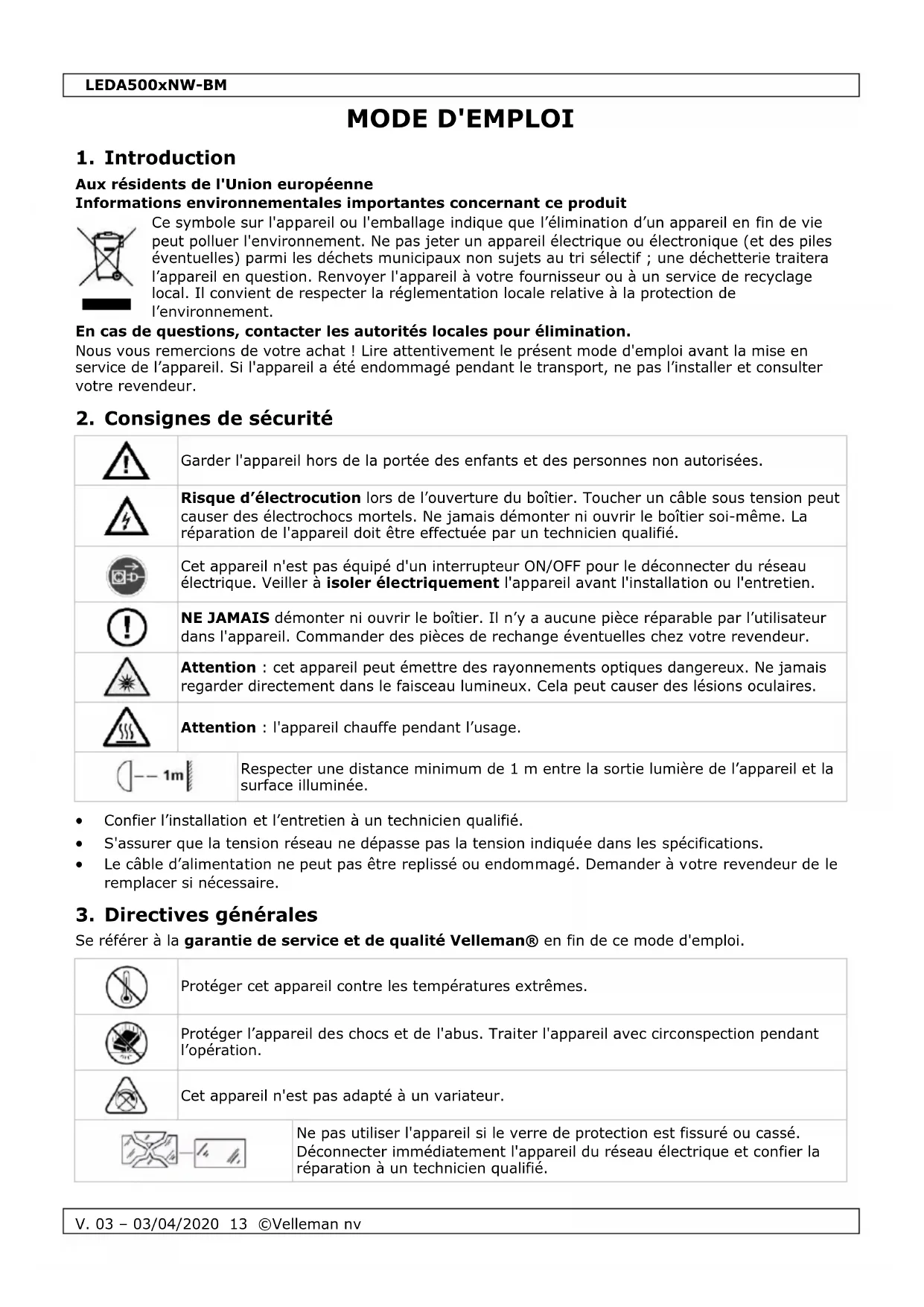 Velleman SA est l’ayant droit des droits d’auteur de ce mode d'emploi. Tous droits mondiaux réservés. Toute reproduction, traduction, copie ou diffusion, intégrale ou partielle, du contenu de ce mode d'emploi par quelque procédé ou sur tout support électronique que ce soit est interdite sans l’accord préalable écrit de l’ayant droit.LEDA500xNW-BM