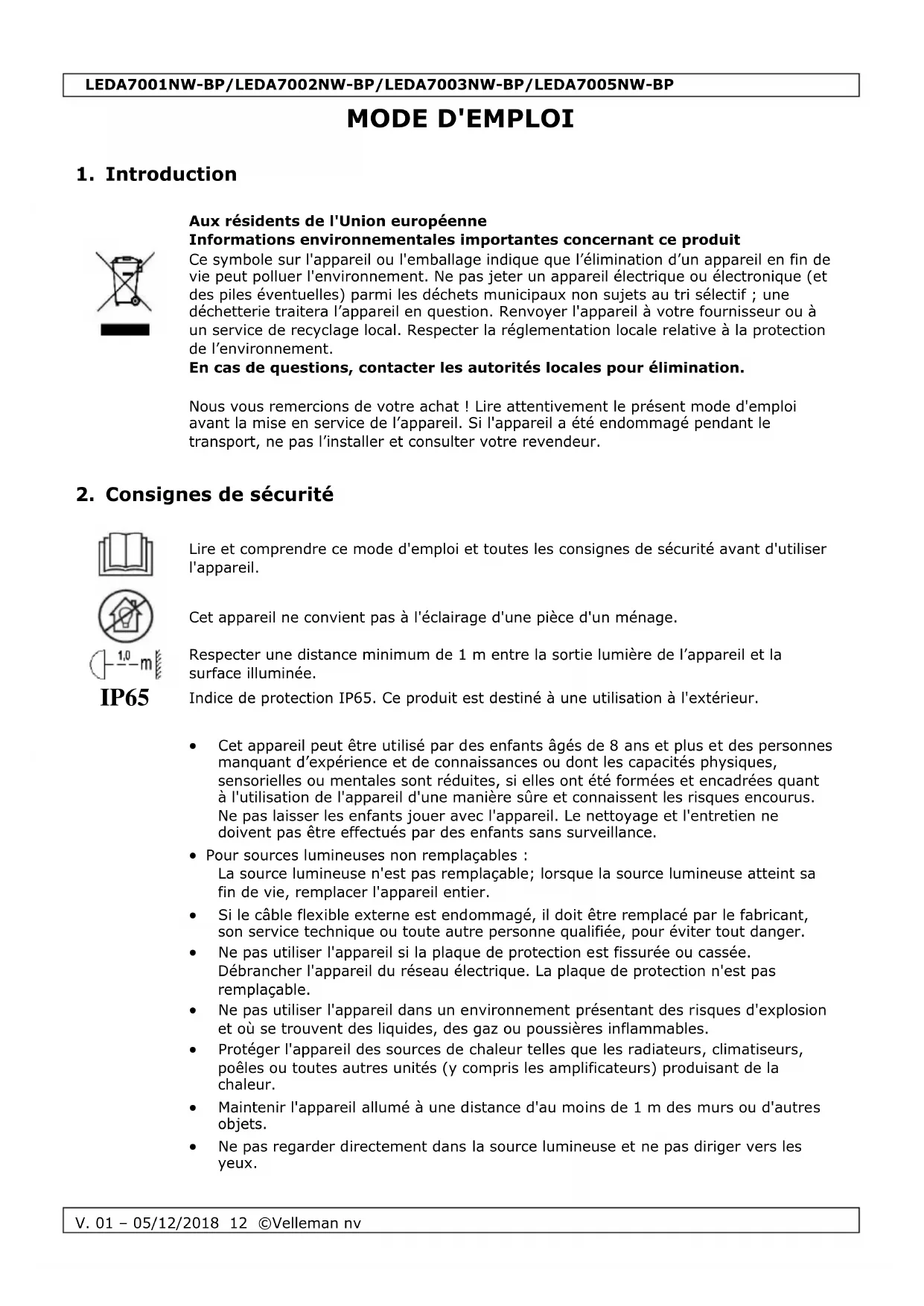 Velleman SA est l’ayant droit des droits d’auteur de ce mode d'emploi. Tous droits mondiaux réservés. Toute reproduction, traduction, copie ou diffusion, intégrale ou partielle, du contenu de ce mode d'emploi par quelque procédé ou sur tout support électronique que ce soit est interdite sans l’accord préalable écrit de l’ayant droit.LEDA7001NW-BP/LEDA7002NW-BP/LEDA7003NW-BP/LEDA7005NW-BP
