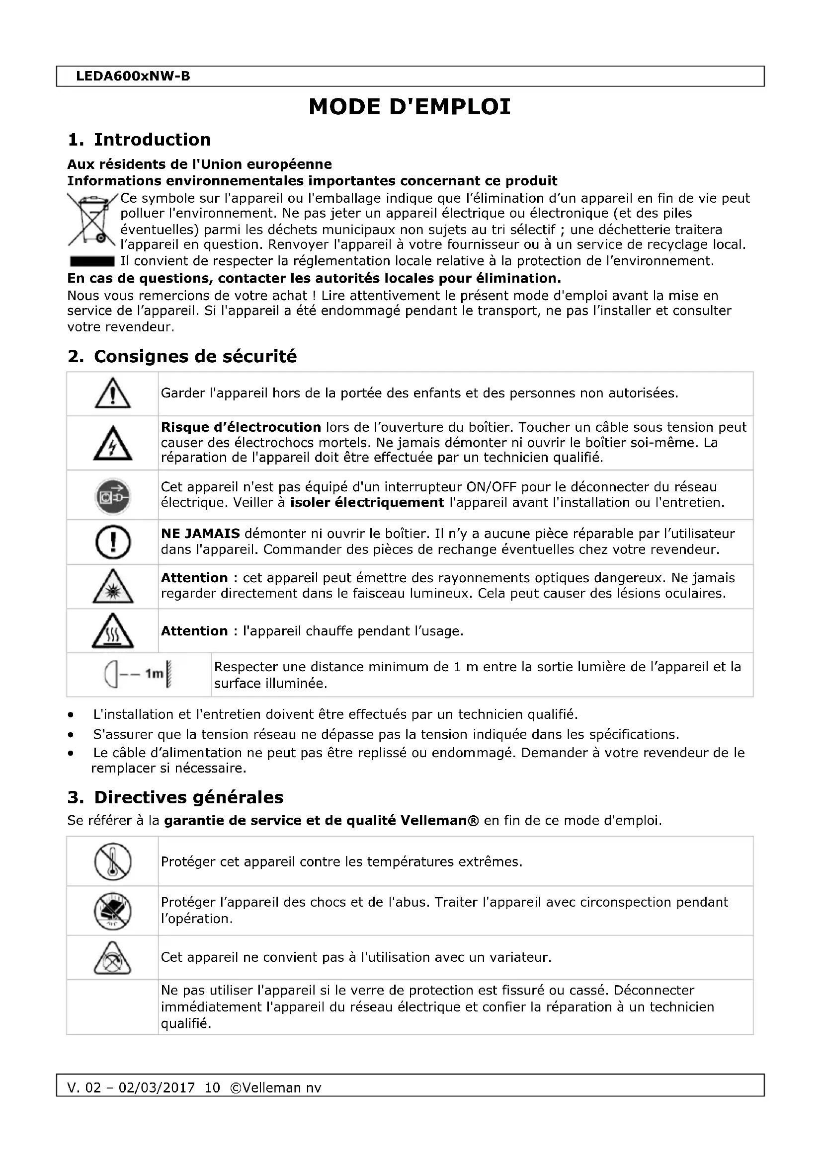 Velleman SA est l’ayant droit des droits d’auteur de ce mode d'emploi. Tous droits mondiaux réservés. Toute reproduction, traduction, copie ou diffusion, intégrale ou partielle, du contenu de ce mode d'emploi par quelque procédé ou sur tout support électronique que ce soit est interdite sans l’accord préalable écrit de l’ayant droit.LEDA600xNW-B