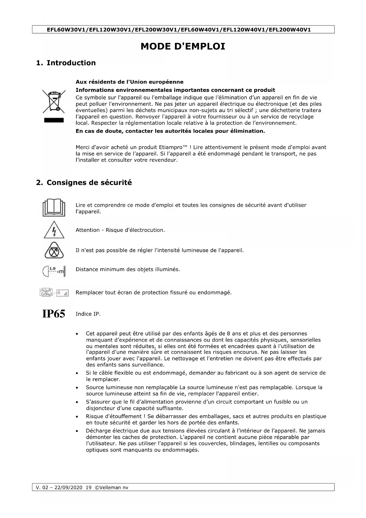 Velleman SA est l’ayant droit des droits d’auteur de ce mode d'emploi. Tous droits mondiaux réservés. Toute reproduction, traduction, copie ou diffusion, intégrale ou partielle, du contenu de ce mode d'emploi par quelque procédé ou sur tout support électronique que ce soit est interdite sans l’accord préalable écrit de l’ayant droit.EFL60W30V1/EFL120W30V1/EFL200W30V1/EFL60W40V1/EFL120W40V1/EFL200W40V1