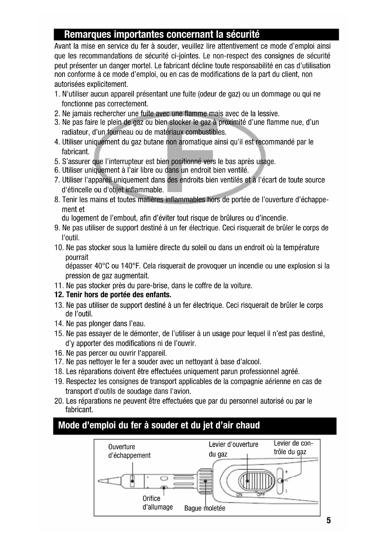Avant la mise en service du fer à souder, veuillez lire attentivement ce mode d’emploi ainsi que les recommandations de sécurité ci-jointes. Le non-respect des consignes de sécurité peut présenter un danger mortel. Le fabricant décline toute responsabilité en cas d’utilisation non conforme à ce mode d’emploi, ou en cas de modifications de la part du client, non autorisées explicitement.