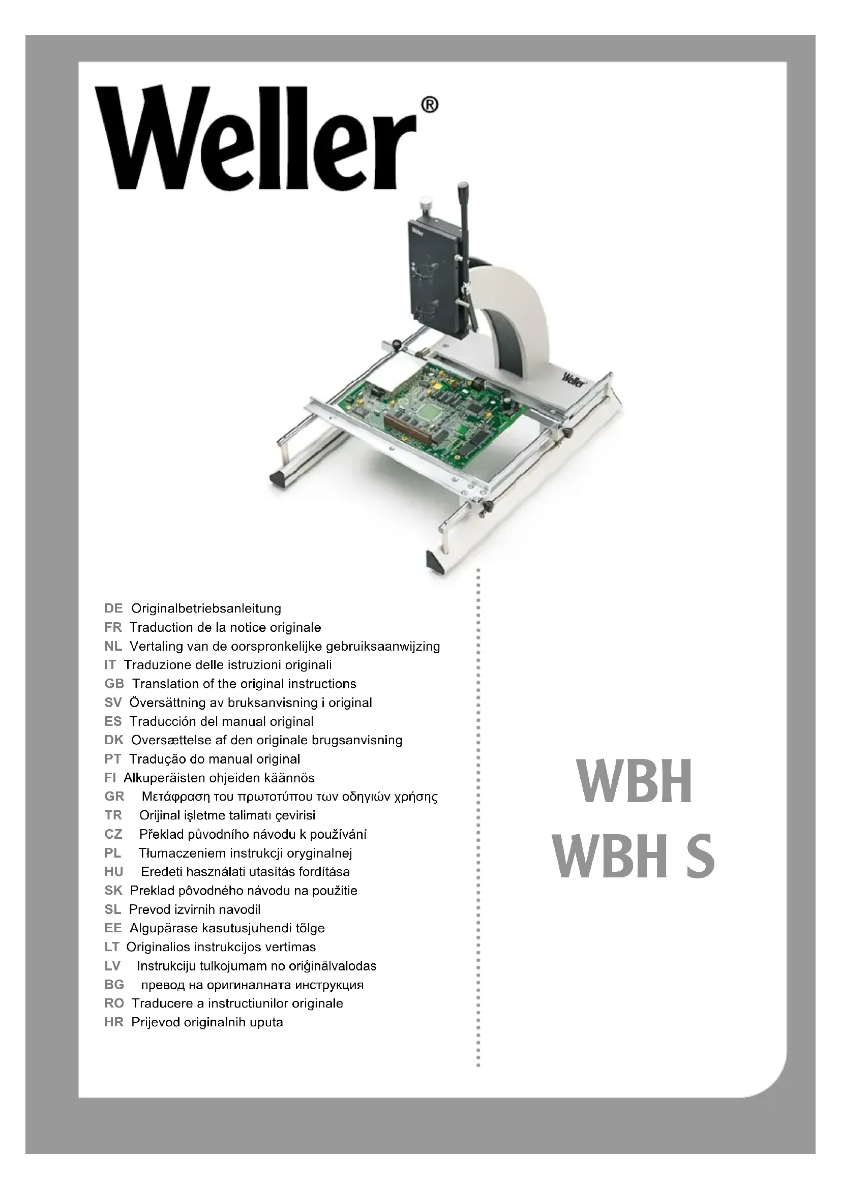Français Nous vous remercions de la confiance que vous nous avez accordée en achetant le support de platine Weller WBH / WBH S. Lors de la fabrication, des exigences de qualité très sévères assurant un fonctionnement parfait de l’appareil, ont été appliquées.