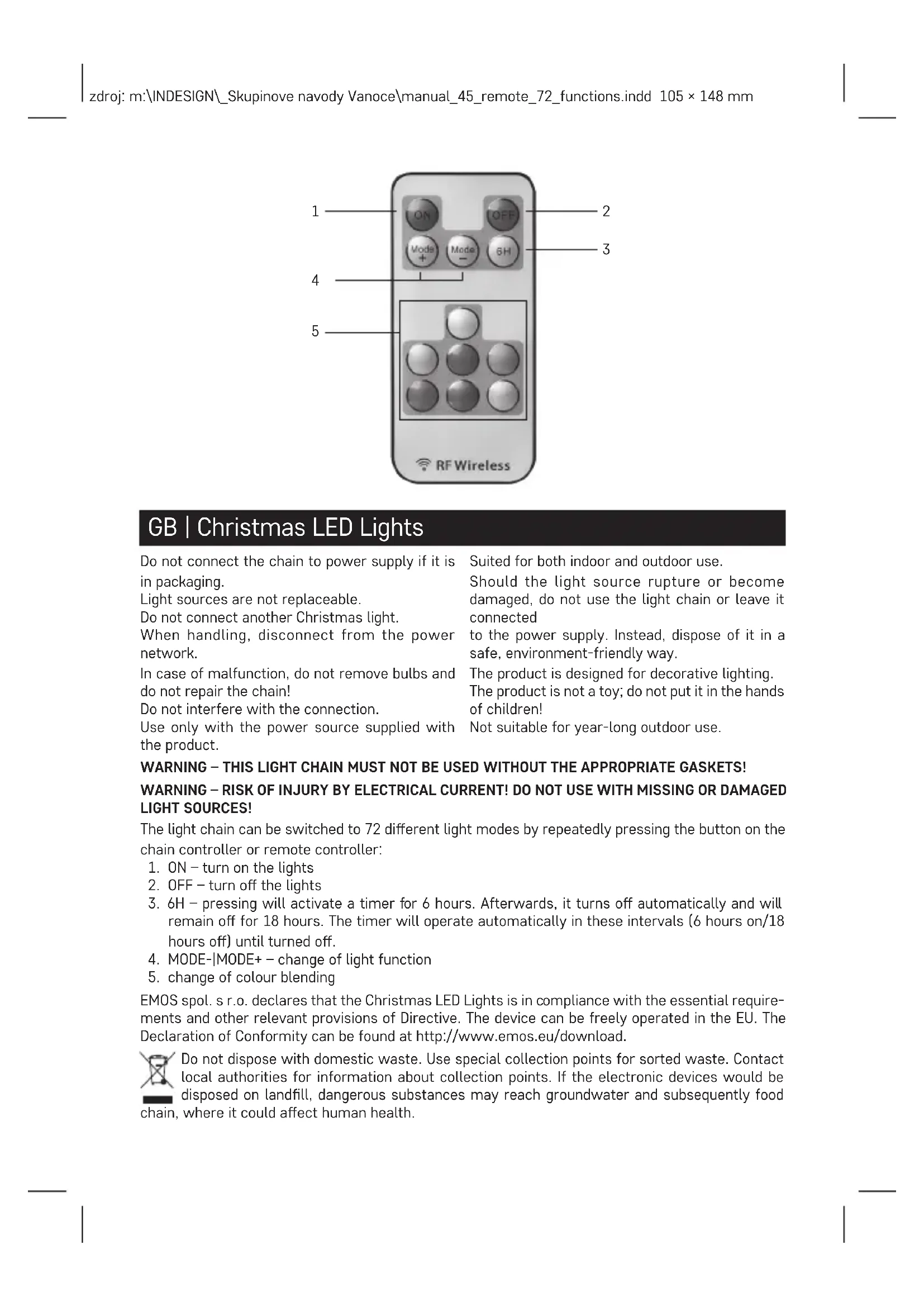 EMOS spol. s r.o. декларира, че Коледни LED лампички, многоцветна отговаря на основните изиск- вания и други разпоредби на Директива. Оборудването може да се използва свободно в рамките на ЕС. Декларацията за съответствие е част от това ръководство и може да бъде намерена също на уебсайта http://www.emos.eu/download. Не изхвърляйте електрически уреди с несортираните домакински отпадъци; предавайте ги в пунктовете за събиране на сортирани отпадъци. Актуална информация относно пункто- вете за събиране на сортирани отпадъци може да получите от компетентните местни орга- ни. При изхвърляне на електрически уреди на сметищата е възможно в подпочвените води да попаднат опасни вещества, които след това да преминат в хранителната верига и да увредят здравето на хората. FR | Luminaire de Noël LED Ne connectez pas la chaîne à l‘alimentation élec- trique si elle est dans son emballage. Les sources lumineuses ne sont pas rempla- çables. Ne connectez pas une autre lumière de Noël. Lors de la manipulation, déconnectez-vous du réseau électrique. En cas de dysfonctionnement, ne retirez pas les ampoules et ne réparez pas la chaîne! N‘interférez pas avec la connexion. Utilisez uniquement avec la source d‘alimentation fournie avec le produit. Convient pour une utilisation intérieure et extérieure. En cas de rupture ou d‘endommagement de la source lumineuse, n‘utilisez pas la chaîne légère et ne la laissez pas branchée à l‘alimentation électrique. Au lieu de cela, jetez-le de manière sûre et respectueuse de l‘environnement. Le produit est conçu pour un éclairage décoratif. Le produit n‘est pas un jouet; ne le mettez pas entre les mains des enfants! Ne convient pas pour une utilisation en extérieur pendant un an. AVERTISSEMENT – CETTE CHAÎNE D‘ÉCLAIRAGE NE DOIT PAS ÊTRE UTILISÉE SANS LES JOINTS APPROPRIÉS!11 AVERTISSEMENT – RISQUE DE BLESSURE PAR COURANT ÉLECTRIQUE! NE PAS UTILISER AVEC DES SOURCES LUMINEUSES MANQUANTES OU ENDOMMAGÉES! La lumière chaîne peut être commuté à 72 diérentes de lumière modes de façon répétée en appuyant sur le bouton sur la chaîne de commande ou à distance contrôleur: