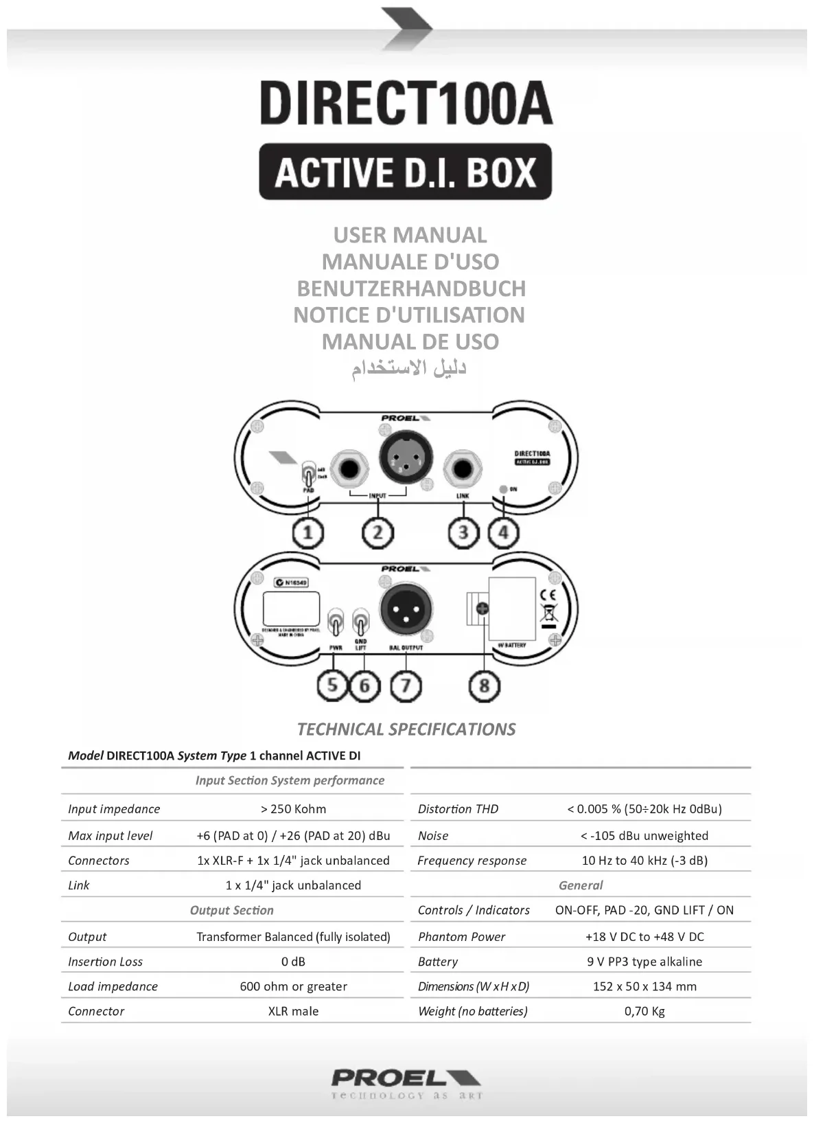 Retrouvez gratuitement la notice de l'appareil Direct100A Proel au format PDF.