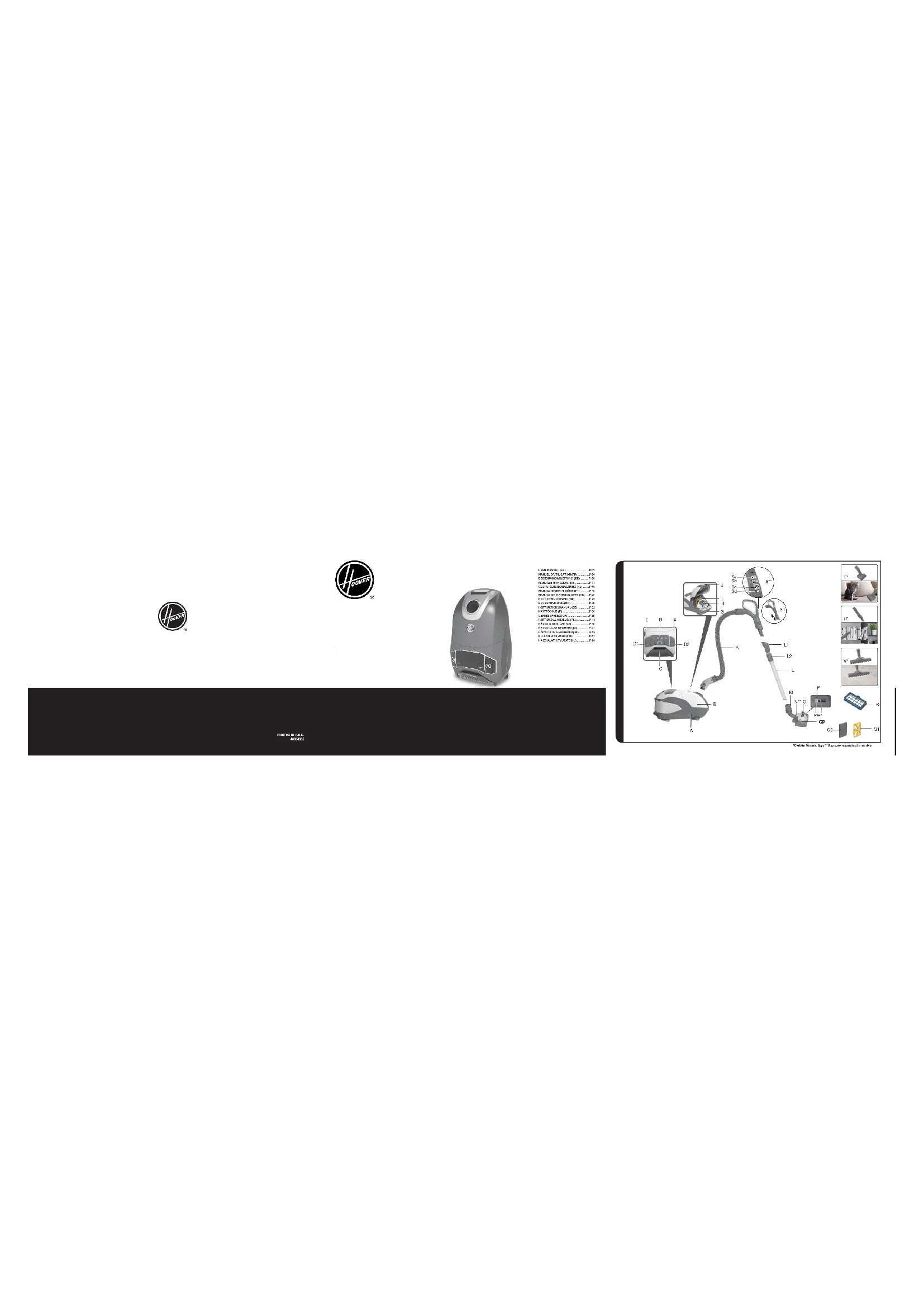J. Loquet de déverrouillage de la trappe K. Flexible L. Tube télescopique L1. Connexion sécurisée du tube télescopique L2. Bouton de réglage du tube télescopique M. Connexion sécurisée de la brosse moquette et sol N. Brosse pour moquette et sol dur (GP)** O. Sélecteur de type de sol P. Variateur de commande d’aspiration de la brosse P1. Mode MIN P2. Mode Maxi Q1. Cadre de ltre pré-moteur Q2. Filtre pré-moteur R. Filtre d’évacuation S. Poignée anti-dérapante avec dispositif de pilotage Hi-Controller intégré** Sa. Boutons de contrôle de puissance variable : Sb. Bouton On/Off mode Auto Sc. Commutateur Marche/Arrêt Sd. Indicateur de batterie LED de la télécommande de la poignée S1. Accessoires intégrés à la poignée : Suceur plat, Brosse à poussière et accessoire de meuble* T. Mini turbobrosse double action pour éliminer les allergènes* U. Accessoire long 2 en 1*