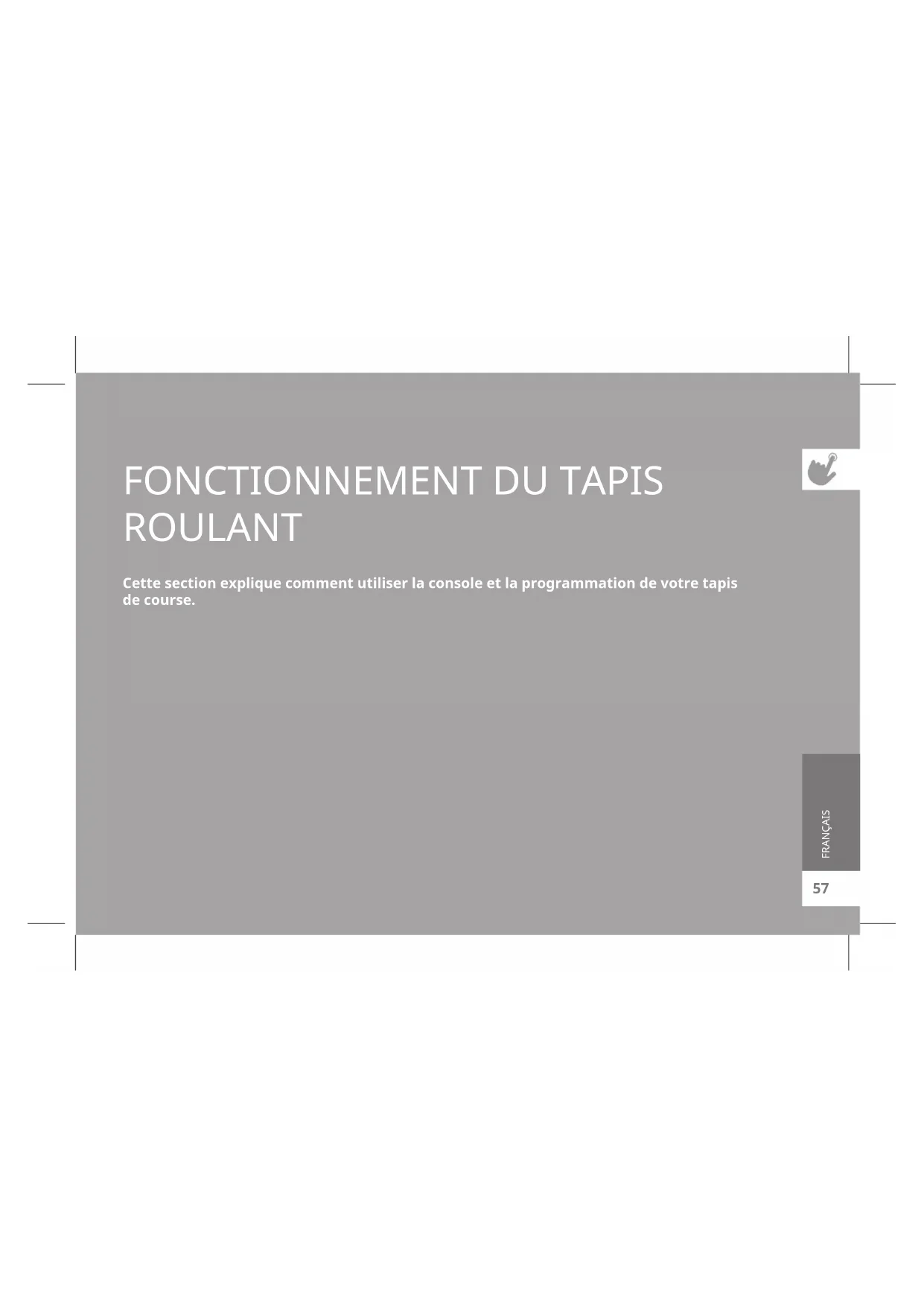 ROULANT Cette section explique comment utiliser la console et la programmation de votre tapis de course. FRANÇAIS58