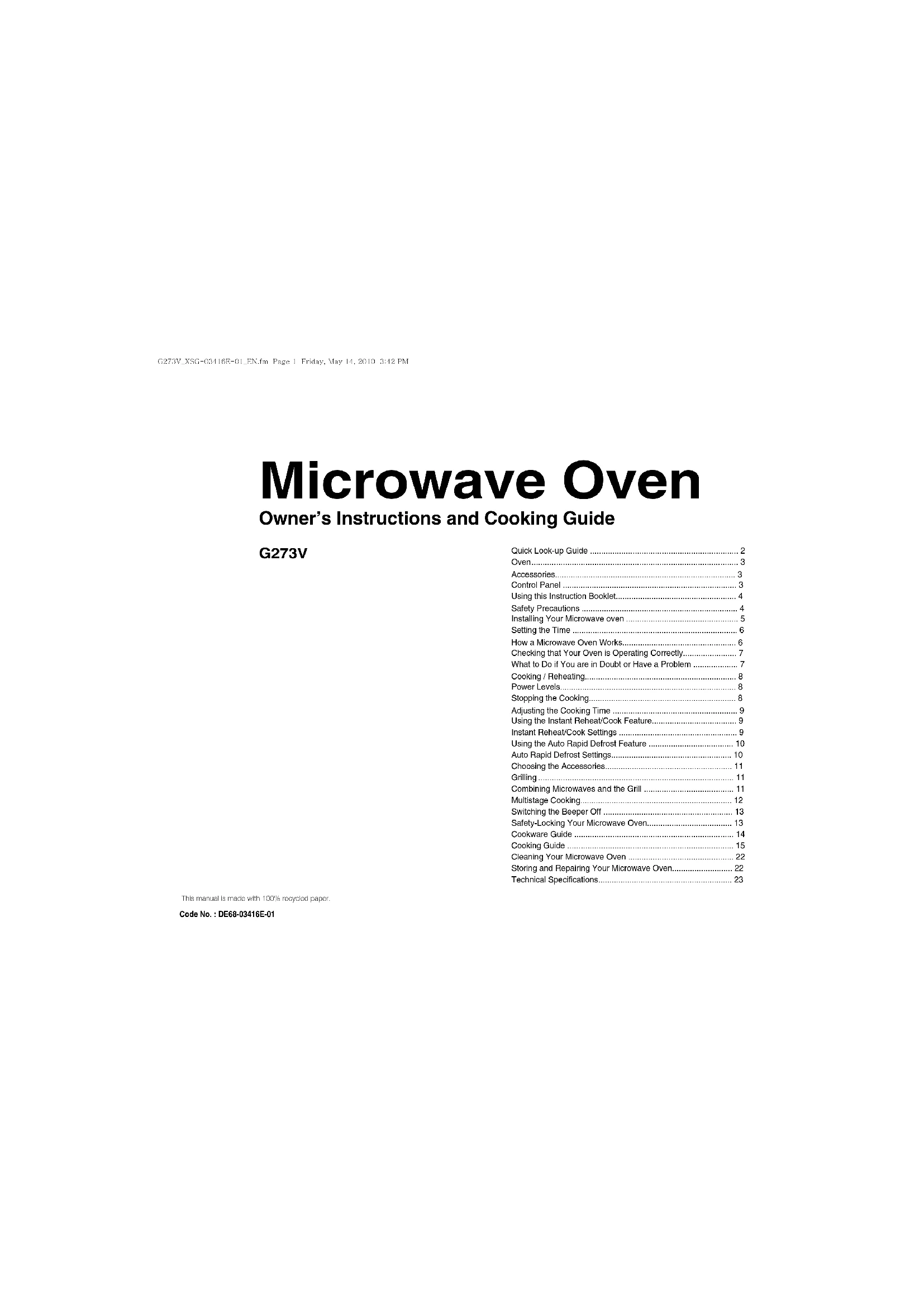 Téléchargez la notice de votre Four à micro-ondes au format PDF gratuitement ! Retrouvez votre notice G273V - SAMSUNG et reprennez votre appareil électronique en main. Sur cette page sont publiés tous les documents nécessaires à l'utilisation de votre appareil G273V de la marque SAMSUNG.