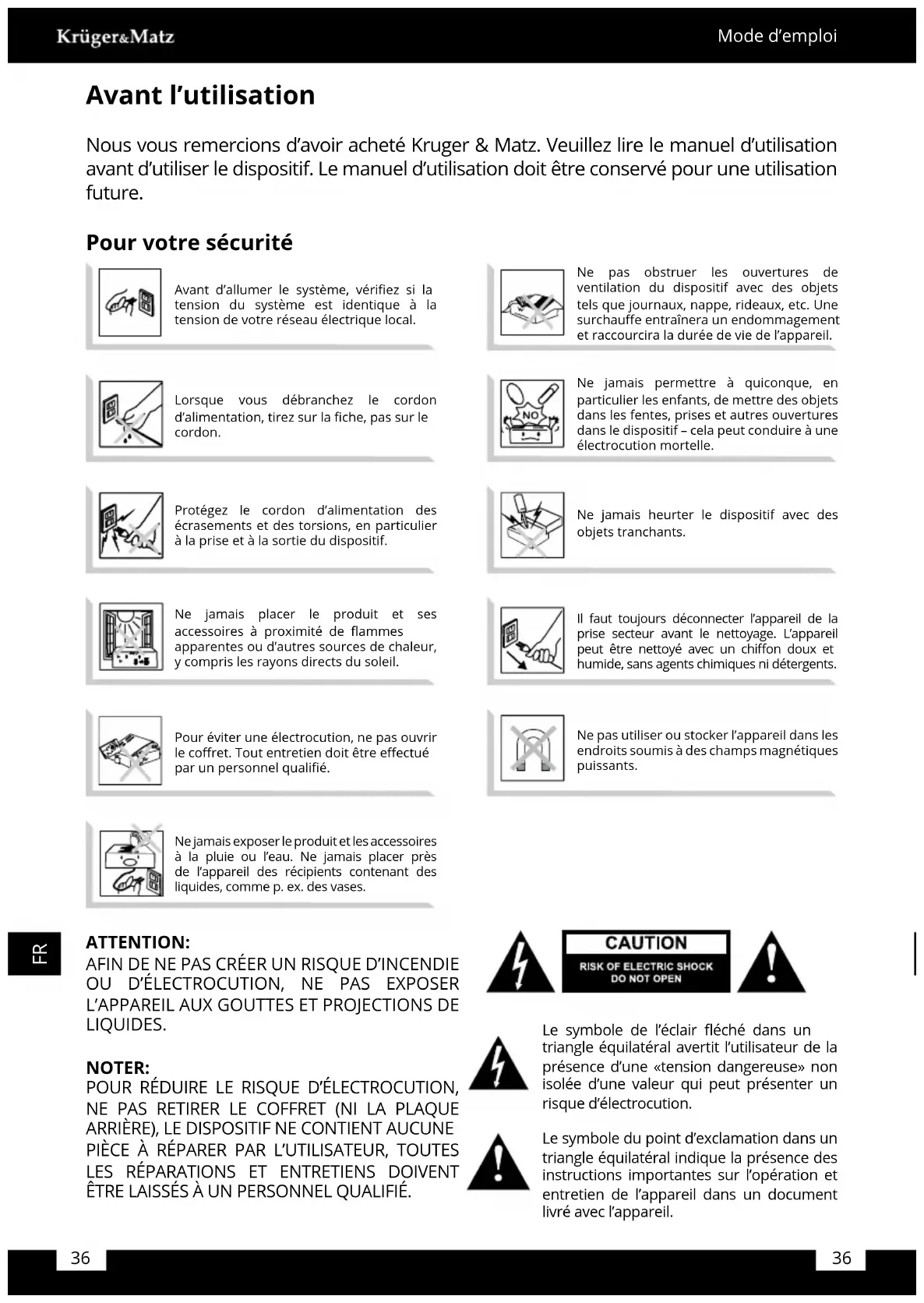 triangle équilatéral avertit l’utilisateur de la présence d’une «tension dangereuse» non isolée d’une valeur qui peut présenter un risque d’électrocution. Le symbole du point d’exclamation dans un triangle équilatéral indique la présence des instructions importantes sur l’opération et entretien de l’appareil dans un document livré avec l’appareil. Avant l’utilisation Nous vous remercions d’avoir acheté Kruger & Matz. Veuillez lire le manuel d’utilisation avant d’utiliser le dispositif. Le manuel d’utilisation doit être conservé pour une utilisation future. Pour votre sécurité tension du système est identique à la tension de votre réseau électrique local.Lorsque vous débranchez le cordon cordon.Protégez le cordon d’alimentation des écrasements et des torsions, en particulier à la prise et à la sortie du dispositif.Ne jamais placer le produit et ses apparentes ou d’autres sources de chaleur, y compris les rayons directs du soleil.Pour éviter une électrocution, ne pas ouvrir Ne jamais exposer le produit et les accessoires à la pluie ou l’eau. Ne jamais placer près de l’appareil des récipients contenant des liquides, comme p. ex. des vases.Ne pas obstruer les ouvertures de ventilation du dispositif avec des objets tels que journaux, nappe, rideaux, etc. Une et raccourcira la durée de vie de l’appareil.Ne jamais permettre à quiconque, en particulier les enfants, de mettre des objets dans les fentes, prises et autres ouvertures dans le dispositif – cela peut conduire à une électrocution mortelle.Ne jamais heurter le dispositif avec des objets tranchants. ATTENTION: AFIN DE NE PAS CRÉER UN RISQUE D’INCENDIE