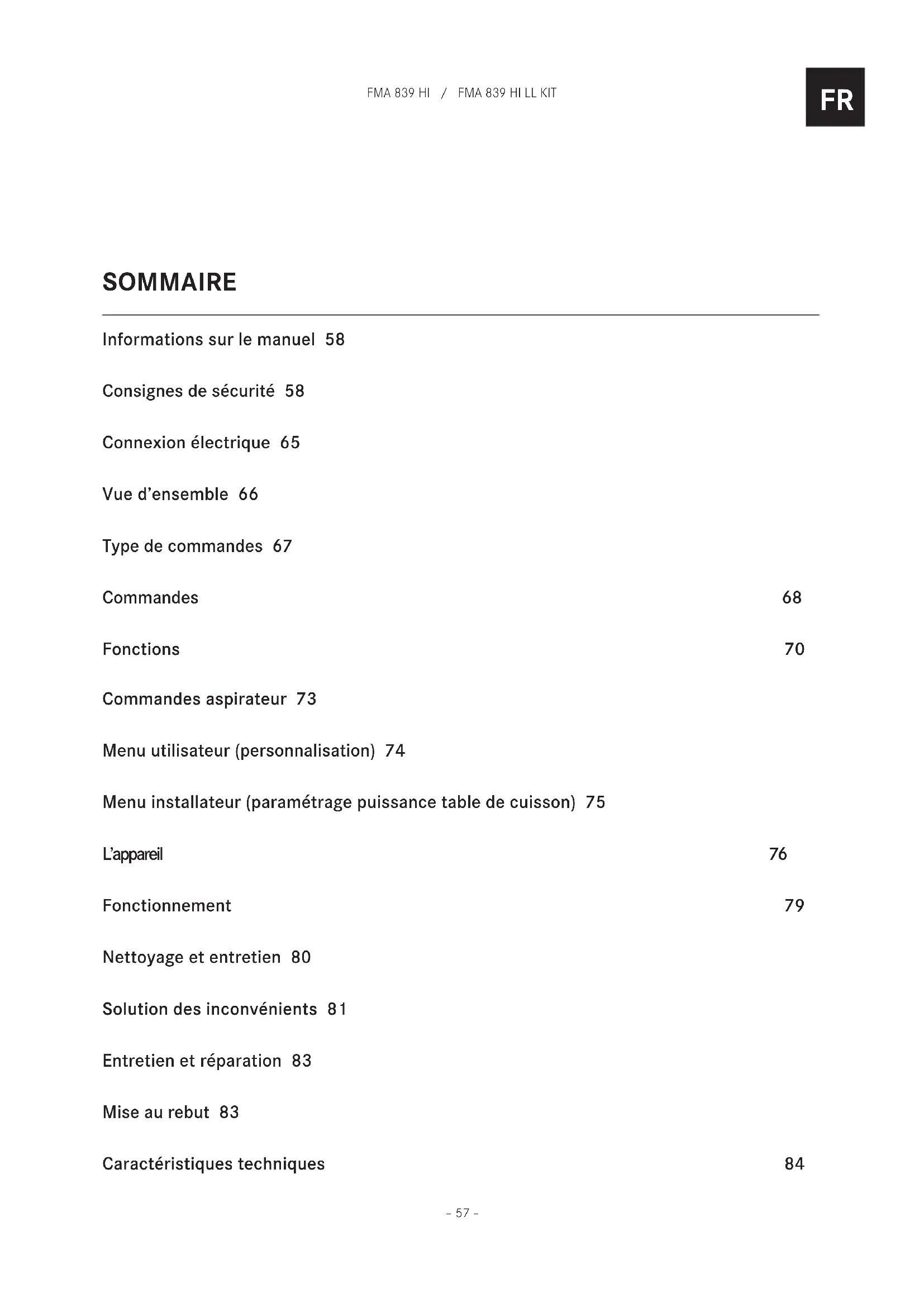 – 57 – Informations sur le manuel 58 Consignes de sécurité 58 Connexion électrique 65 Vue d’ensemble 66 Type de commandes 67 Commandes 68 Fonctions 70 Commandes aspirateur 73 Menu utilisateur (personnalisation) 74 Menu installateur (paramétrage puissance table de cuisson) 75 L’appareil 76 Fonctionnement 79 Nettoyage et entretien 80 Solution des inconvénients 81 Entretien et réparation 83 Mise au rebut 83 Caractéristiques techniques 84 SOMMAIREFR