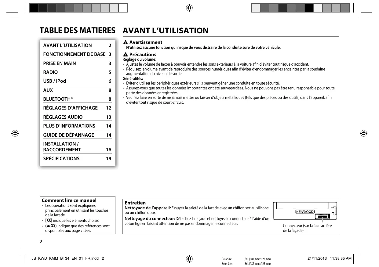 Vert/noir [ Rouge (Câble d’allumage) Bleu clair/jaune (Fil de télécommande de volant) Câble de batterie (Jaune) Câblage par défaut Jaune Bleu/Blanc Rouge Noir Jaune (Câble de batterie) Appareil Véhicule Si aucune connexion n’est faite, ne laissez pas le câble sortir de la languette. Couleur et fonction : Pile : Commande d’alimentation : Allumage (ACC) : Connexion à la terre (masse) : Enceinte arrière (droit) Bleu/Blanc (Fil de commande d’alimentation/ Câble de commande de l’antenne) Marron (Câble de contrôle de la sourdine) À l’adaptateur de télécommande volant P. CONT À la borne de commande d’alimentation lorsque vous utilisez l’amplificateur de puissance en option, soit à la borne de commande d’antenne du véhicule. MUTE Pour connecter au système de navigation Kenwood, consultez votre manuel de navigation. ANT CONT : Enceinte avant (droit) : Enceinte avant (gauche) : Enceinte arrière (gauche) Connecteurs ISO Liste des pièces pour l’installation Sortie arrière/caisson de grave (A) Façade Borne de l’antenne Prise d’entrée du microphone ( 8) (B) Plaque d’assemblage Si aucune connexion n’est faite, ne laissez pas le câble sortir de la languette. Blanc À l’enceinte avant (gauche) Blanc/Noir À l’enceinte avant (droite) Gris/Noir Vers l’enceinte arrière (gauche) Vert/Noir Gris Bleu clair/jaune (Fil de télécommande de volant) Vert Violet Vers l’enceinte arrière (droite) À l’adaptateur de télécommande volant (C) Manchon de montage Bleu/Blanc (Fil de commande d’alimentation) À la borne de commande d’alimentation lorsque vous utilisez l’amplificateur de puissance en option, soit à la borne de commande d’antenne du véhicule. Marron (Câble de contrôle de la sourdine) Pour connecter au système de navigation Kenwood, reportez-vous à votre manuel de navigation. Bleu (Câble de commande de l’antenne) (Non utilisé) (D) Faisceau de fils (pour KMM-BT34 / KMM-302BT ) Violet/Noir Interrupteur d’allumage Boîte de fusible de la voiture Rouge (Câble d’allumage) Boîte de fusible de la voiture Jaune (Câble de batterie) Noir (Fil de masse) Vers corps métallique ou châssis de la voiture (E) Clé d’extraction Pile Standard USB Système de fichiers Courant d’alimentation maximum Réponse en fréquence (±1 dB) Taux de Signal/Bruit (1 kHz) Gamme dynamique Séparation des canaux Décodage MP3 Décodeur WMA Décodeur WAV Décode FLAC USB 1.1, USB 2.0 (vitesse maximale) FAT 12/ 16/ 32 CC 5 V 1 A 20 Hz — 20 kHz 105 dB 88 dB 90 dB Compatible avec le format MPEG-1/2 Audio Layer-3 Compatible Windows Media Audio RIFF Format audio de forme d’onde (PCM linéaire uniquement) Fichiers FLAC Bluetooth Version Plage de fréquences Puissance de sortie Portée de communication maximale Profile Bluetooth Ver.2.1+EDR Certified 2,402 GHz — 2,480 GHz +4 dBm (MAX), 0 dBm (AVE) Power Class 2 Ligne de vue approximative 10 m HFP (Hands-Free Profile — Profile mains libres)/ SPP (Serial Port Profile — Profile de port série)/ PBAP (Phonebook Access Profile — Profile d’accès au répertoire d’adresses) OPP (Object Push Profile — Profile de poussée d’objet)/ A2DP (Advanced Audio Distribution Profile — Profile de distribution audio avancé)/ AVRCP (Audio/Video Remote Control Profile — Profile de télécommande audio/vidéo) Ver. 1.3 Puissance de sortie maximum Puissance de sortie (DIN 45324, +B = 14,4 V) Impédance d’enceinte Action en tonalité 50 W × 4 30 W × 4 Niveau de préamplification/charge Impédance du préamplificateur Réponse en fréquence (±3 dB) Tension maximum d’entrée Impédance d’entrée 20 Hz — 20 kHz 1 200 mV 30 kΩ Tension de fonctionnement Consommation de courant maximale Plage de températures de fonctionnement Dimensions d’installation (L × H × P) Poids Plage de fréquences Sensibilité utilisable (S/B = 26 dB) Seuil de sensibilité (DIN S/N = 46 dB) Réponse en fréquence (±3 dB) Taux de Signal/Bruit (MONO) Séparation stéréo (1 kHz) Plage de fréquences Sensibilité utilisable (S/B = 20 dB) Plage de fréquences Sensibilité utilisable (S/B = 20 dB) Généralités Tuner