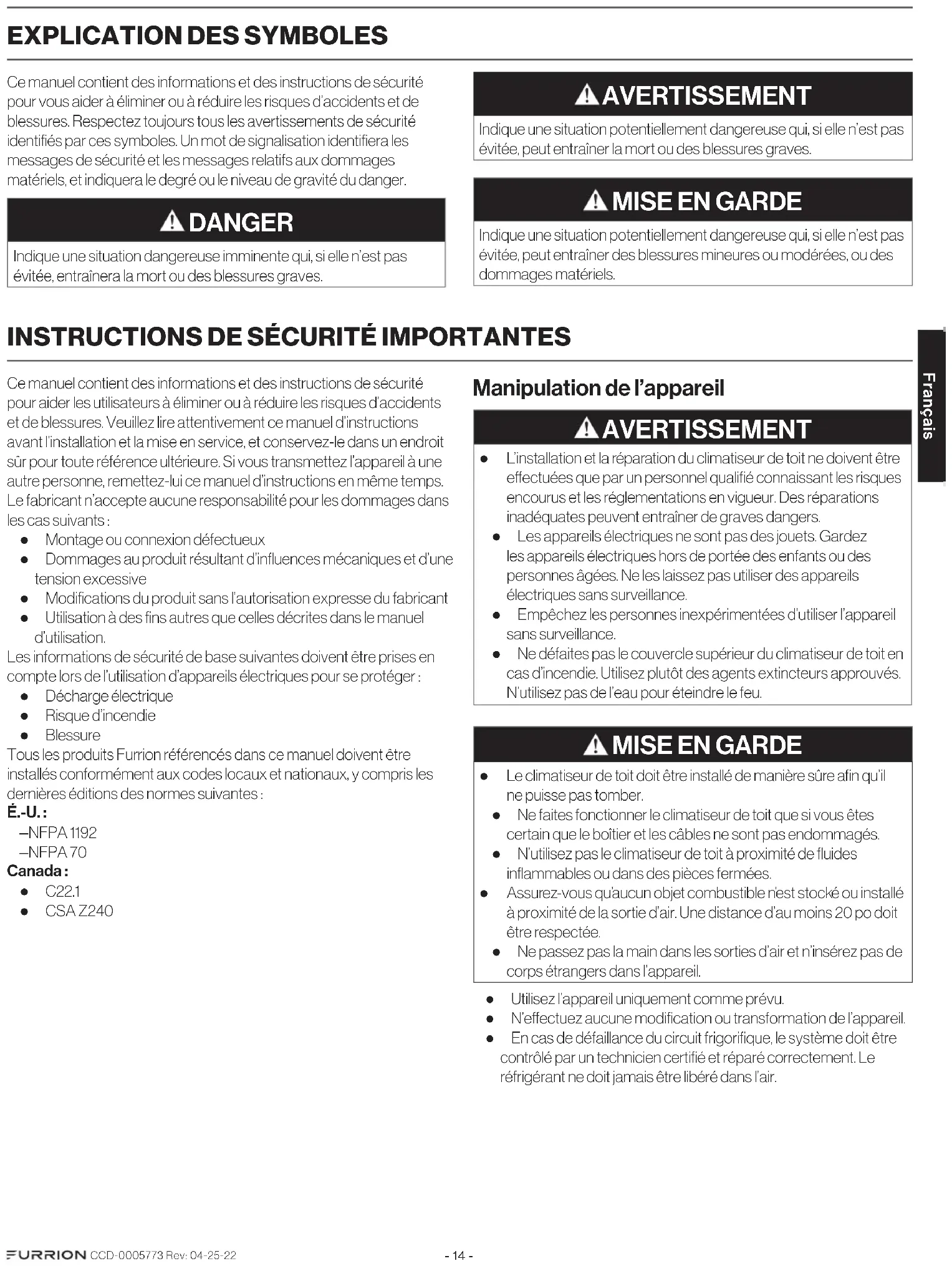 Ce manuel contient des informations et des instructions de sécurité pour aider les utilisateurs à éliminer ou à réduire les risques d’accidents et de blessures. Veuillez lire attentivement ce manuel d’instructions avant l’installation et la mise en service, et conservez-le dans un endroit sûr pour toute référence ultérieure. Si vous transmettez l’appareil à une autre personne, remettez-lui ce manuel d’instructions en même temps. Le fabricant n’accepte aucune responsabilité pour les dommages dans les cas suivants: ● Montage ou connexion défectueux ● Dommages au produit résultant d’influences mécaniques et d’une tension excessive ● Modifications du produit sans l’autorisation expresse du fabricant ● Utilisation à des fins autres que celles décrites dans le manuel d’utilisation. Les informations de sécurité de base suivantes doivent être prises en compte lors de l’utilisation d’appareils électriques pour se protéger: ● Décharge électrique ● Risque d’incendie ● Blessure Tous les produits Furrion référencés dans ce manuel doivent être installés conformément aux codes locaux et nationaux, y compris les dernières éditions des normes suivantes: É.-U.: – NFPA1192 – NFPA70 Canada: ● C22.1 ● CSAZ240 Manipulation de l’appareil AVERTISSEMENT ● L’installation et la réparation du climatiseur de toit ne doivent être eectuées que par un personnel qualifié connaissant les risques encourus et les réglementations en vigueur. Des réparations inadéquates peuvent entraîner de graves dangers. ● Les appareils électriques ne sont pas des jouets. Gardez les appareils électriques hors de portée des enfants ou des personnes âgées. Ne les laissez pas utiliser des appareils électriques sans surveillance. ● Empêchez les personnes inexpérimentées d’utiliser l’appareil sans surveillance. ● Ne défaites pas le couvercle supérieur du climatiseur de toit en cas d’incendie. Utilisez plutôt des agents extincteurs approuvés. N’utilisez pas de l’eau pour éteindre le feu.