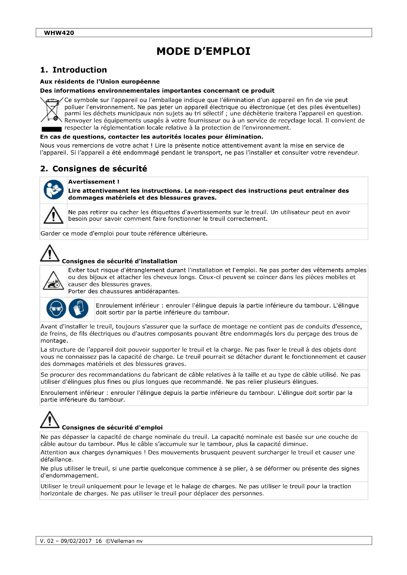 Consignes de sécurité d'emploi Ne pas dépasser la capacité de charge nominale du treuil. La capacité nominale est basée sur une couche de câble autour du tambour. Plus le câble s’accumule sur le tambour, plus la capacité diminue. Attention aux charges dynamiques ! Des mouvements brusquent peuvent surcharger le treuil et causer une défaillance. Ne plus utiliser le treuil, si une partie quelconque commence à se plier, à se déformer ou présente des signes d'endommagement. Utiliser le treuil uniquement pour le levage et le halage de charges. Ne pas utiliser le treuil pour la traction horizontale de charges. Ne pas utiliser le treuil pour déplacer des personnes.WHW420