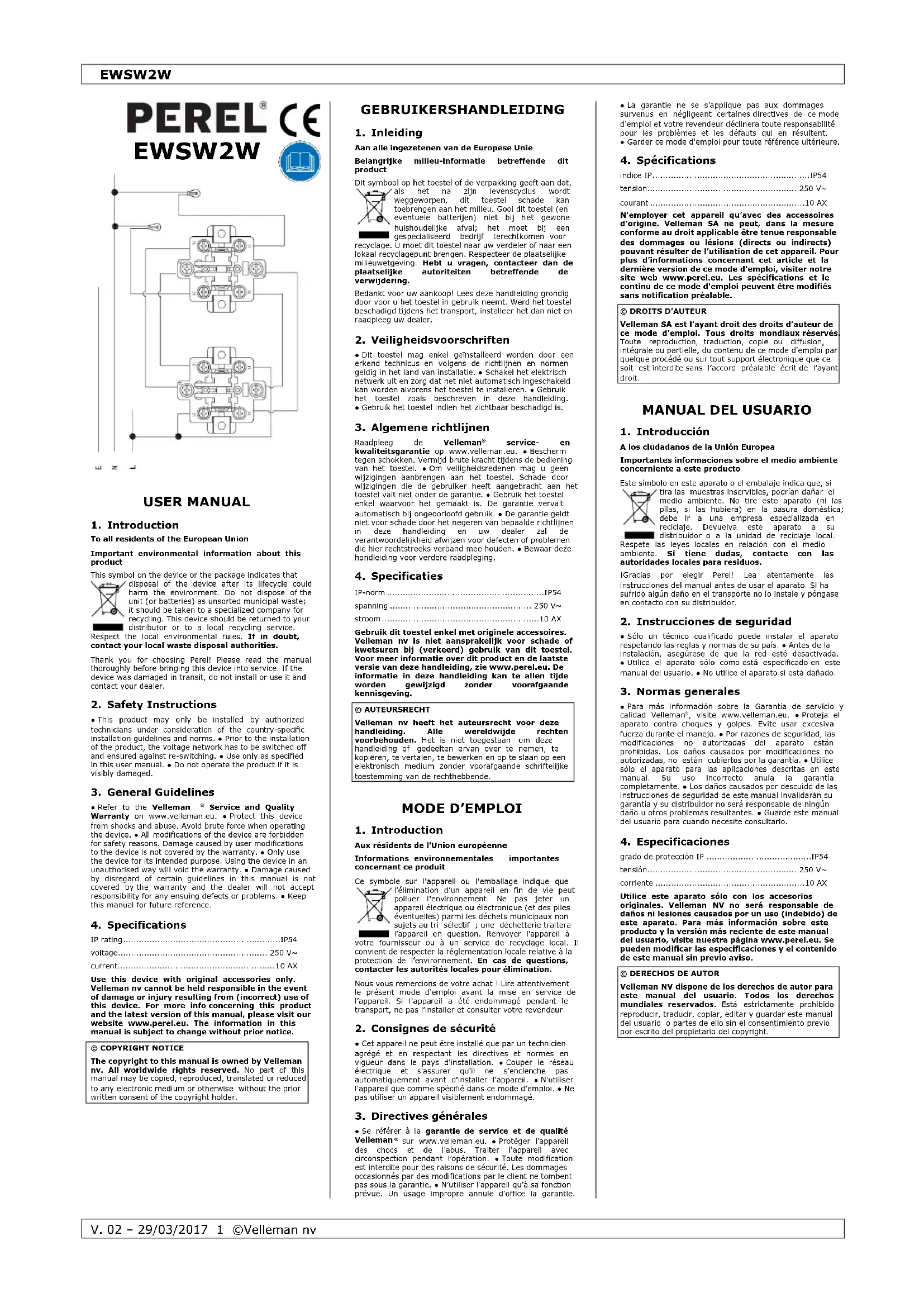 - V~ courant AX N'employer cet appareil qu’avec des accessoires d’origine. Velleman SA ne peut, dans la mesure conforme au droit applicable être tenue responsable des dommages ou lésions (directs ou indirects) pouvant résulter de l’utilisation de cet appareil. Pour plus d’informations concernant cet article et la dernière version de ce mode d'emploi, visiter notre site web www.perel.eu. Les spécifications et le continu de ce mode d'emploi peuvent être modifiés sans notification préalable. p. 10