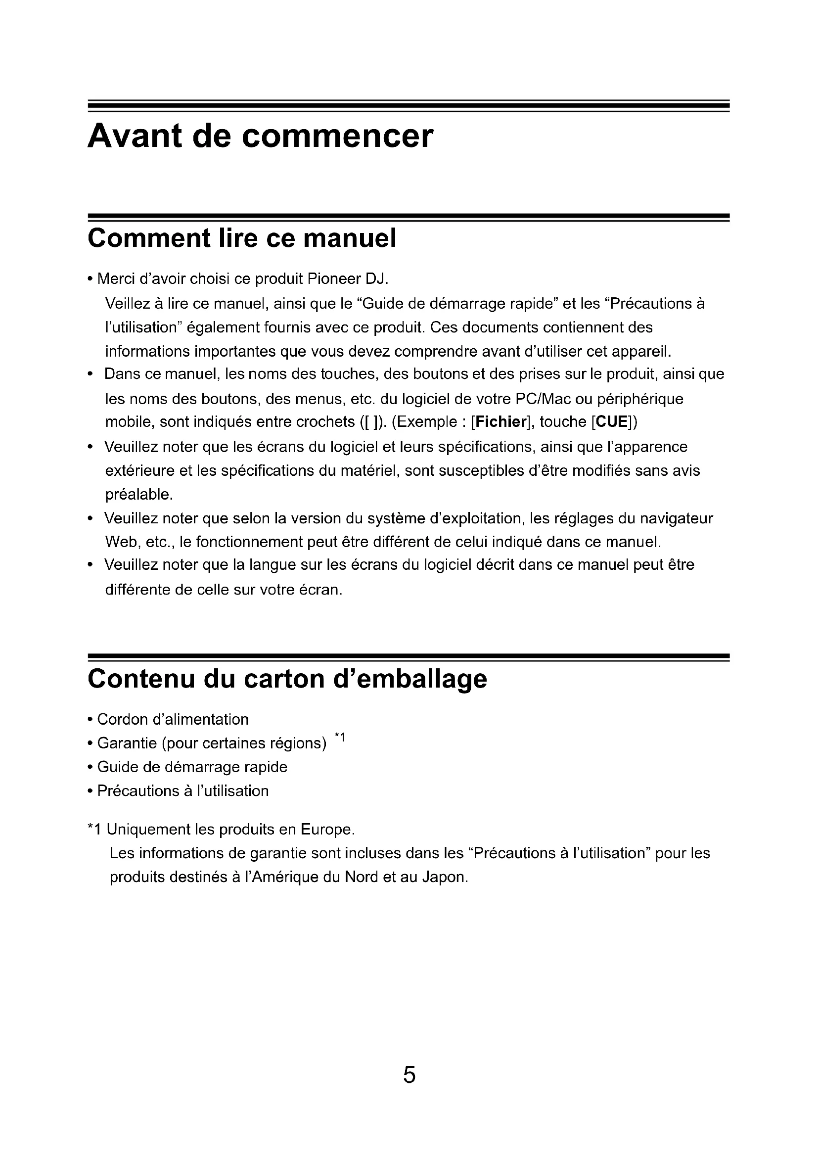 - Merci d’avoir choisi ce produit Pioneer DJ. Veillez à lire ce manuel, ainsi que le “Guide de démarrage rapide” et les “Précautions à l’utilisation” également fournis avec ce produit. Ces documents contiennent des informations importantes que vous devez comprendre avant d’utiliser cet appareil.